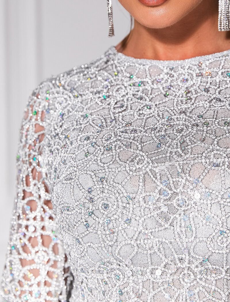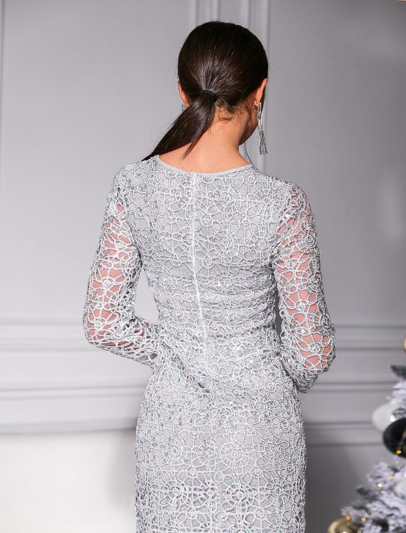 A short evening dress in silver color, complemented by openwork beauty with mother-of-pearl sequins: straight cut, round neck, long sleeve, knitted lining with lurex thread.