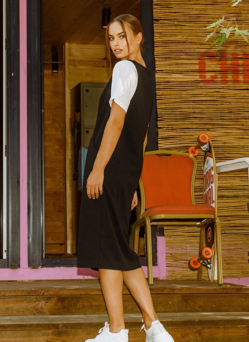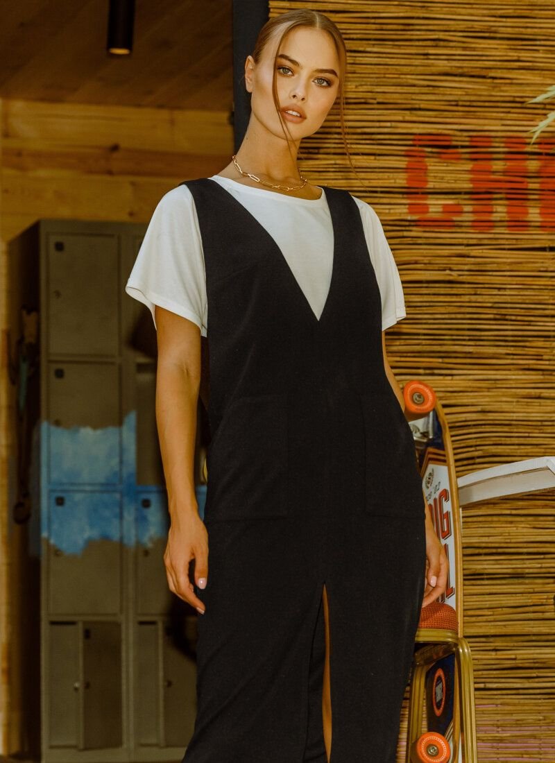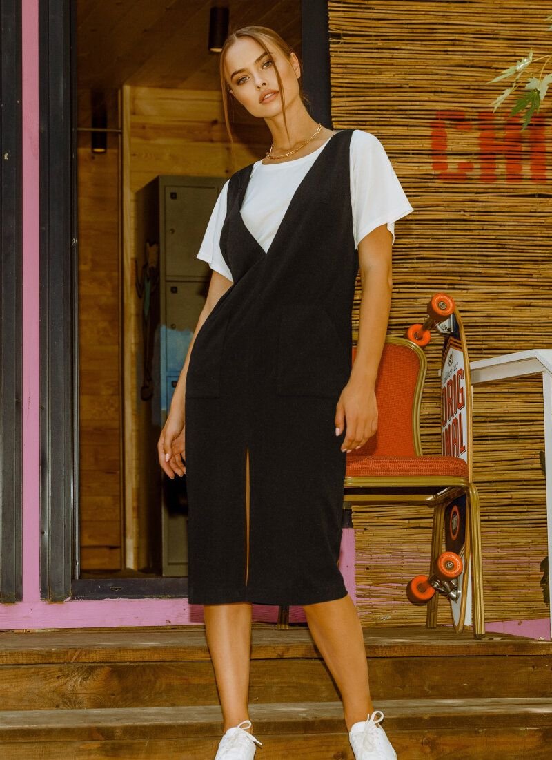 The sundress is made in a basic black color. The restrained straight cut is complemented by a deep v-neck, accentuating the decollete area. Patch pockets are located on the hip line. The final accent of the image puts a high slit on the skirt.