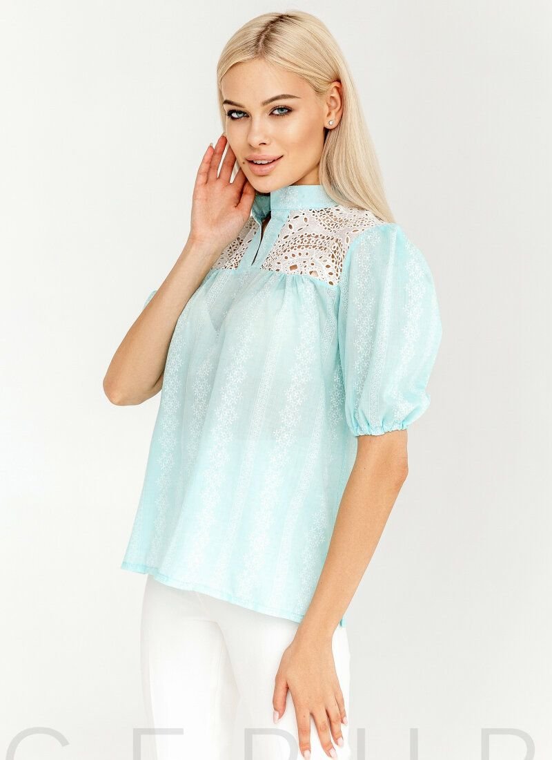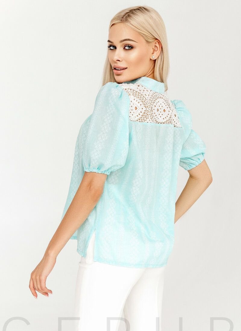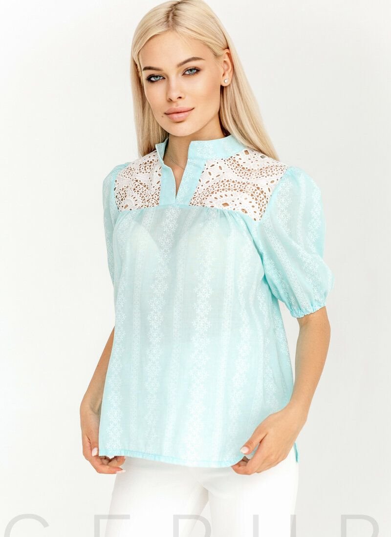 A blue blouse of a loose cut made of cambric with patterned embroidery with ethnic motifs. Voluminous sleeves with elastic cuff and V-neck.