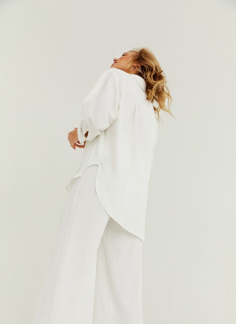 The lightweight, airy material makes the suit an ideal solution for a relaxed look in warm weather. The set consists of a loose shirt with a rounded asymmetrical edge and flared trousers. Elastic waistband provides a comfortable fit.