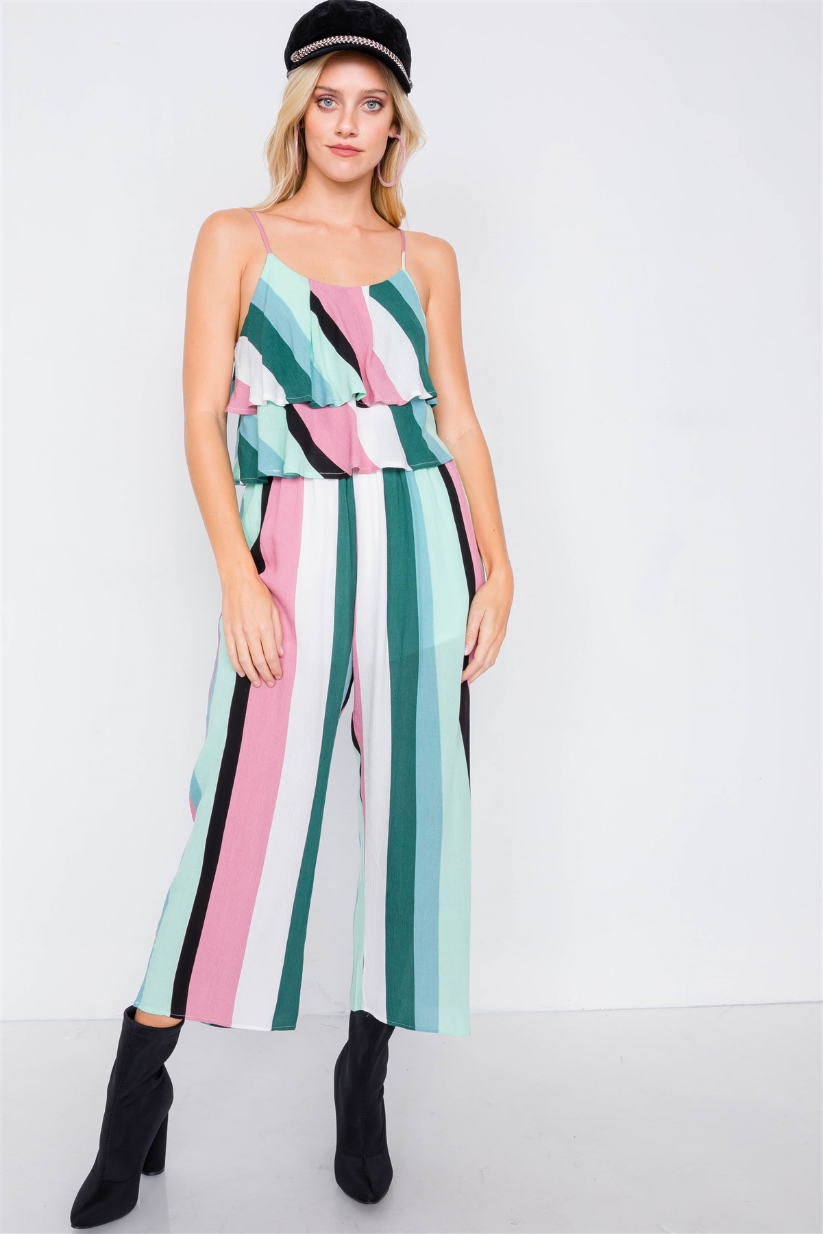 ImportedS.M.Ladjustable cami straps, flounce layer bodice, elastic waist band, blue black white orange and peach vertical striped color block, mini ankle slit, partially lined, stretchy.100% Rayon Sage RoseTSH