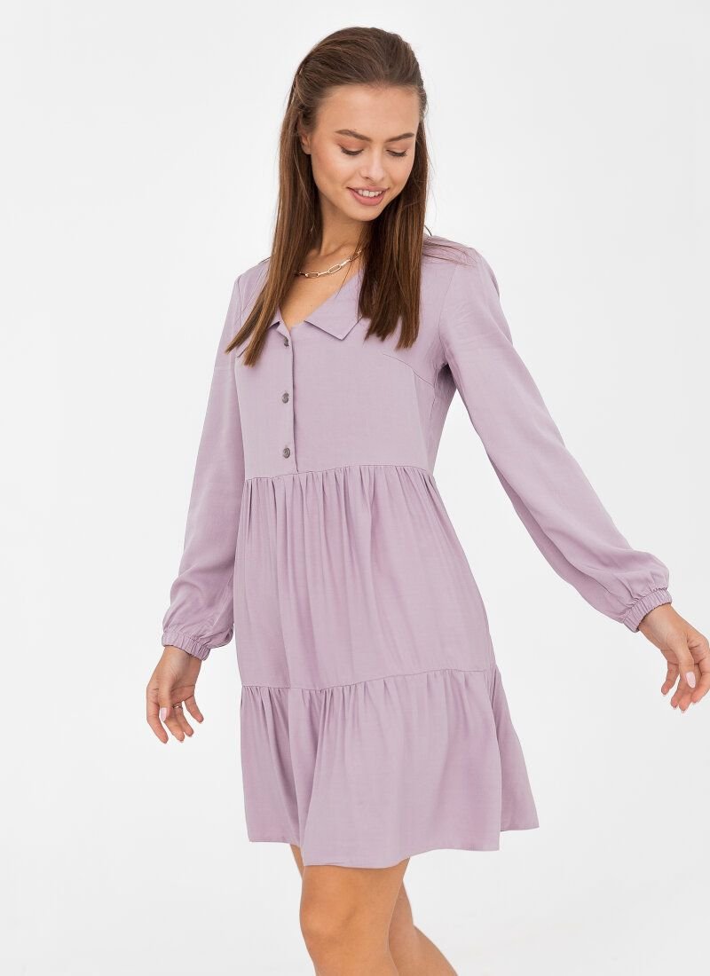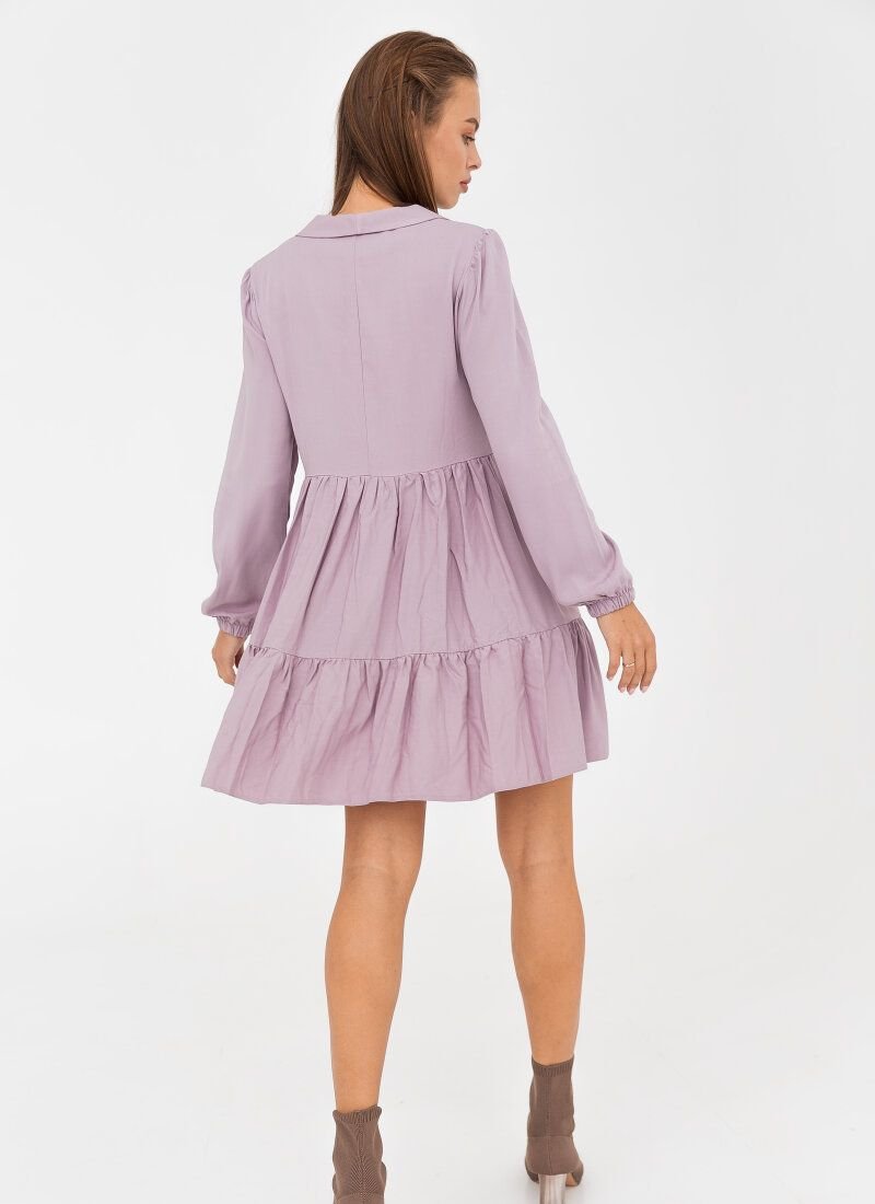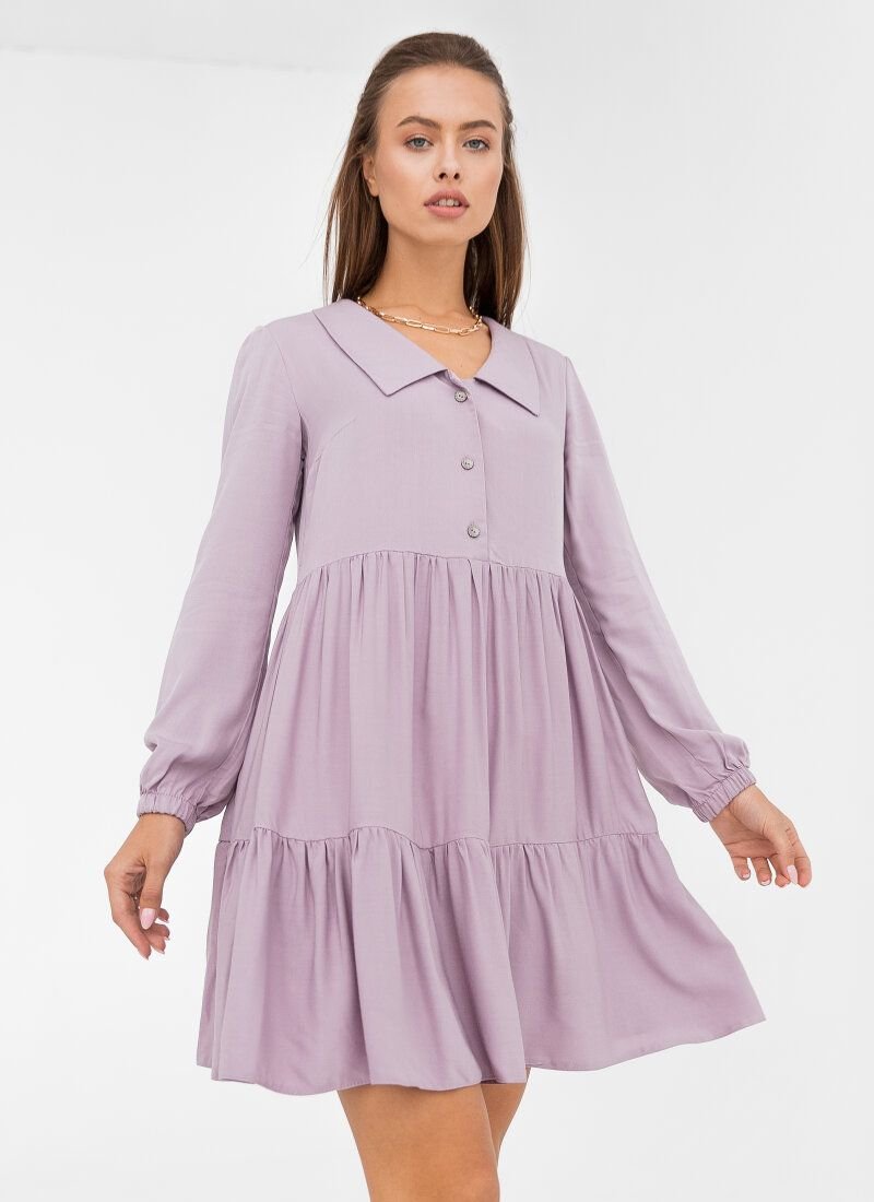 The delicate lavender shade of this dress will make the image as feminine as possible. For the manufacture of the product, a soft flying material is selected, which lies in waves in a two-tiered skirt. The model is complemented by a turn-down collar and long sleeves with an elastic cuff.
