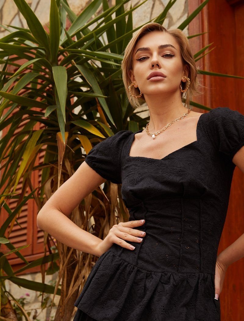 A short dress will make you look feminine. The model made of mixed cotton was decorated with sophisticated floral embroidery. The romantic mood set by the material was supported by lantern sleeves and a skirt made of flounces. Such a thing will look good with high-heeled sandals and ballet flats.