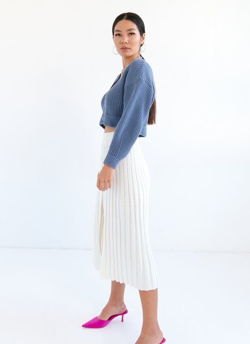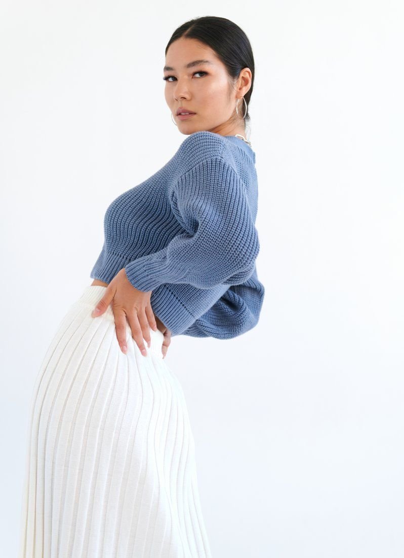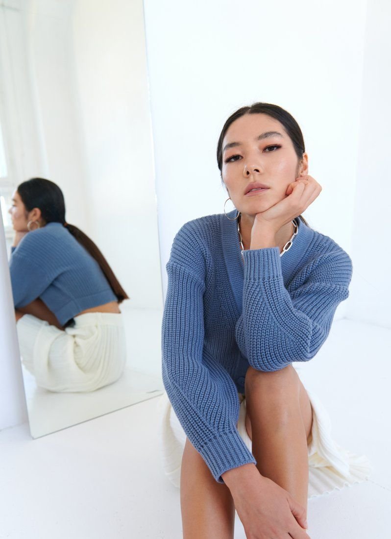 This collection features an indigo jumper. A feature of the model is a shortened cut, without focusing on buttons, as they match the tone of the product. An easily matched jumper will be a universal choice for any wardrobe.