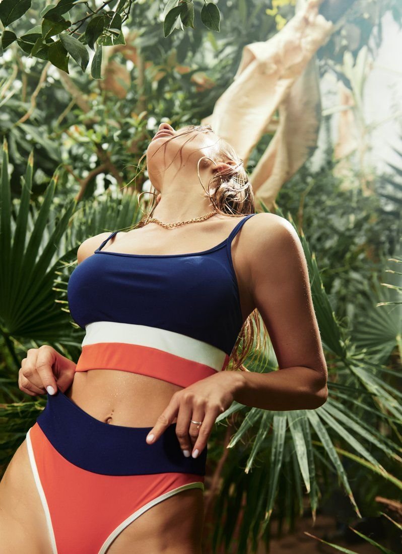 To create a separate swimsuit in blue, a smooth elastic material was used, which emphasizes the dignity of the figure. A top with thin straps with tight cups provides optimal breast support. The top and bottom of the set are contrasting striped straps in the color block style.