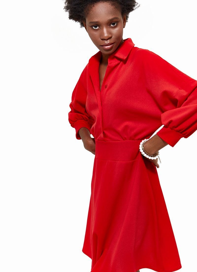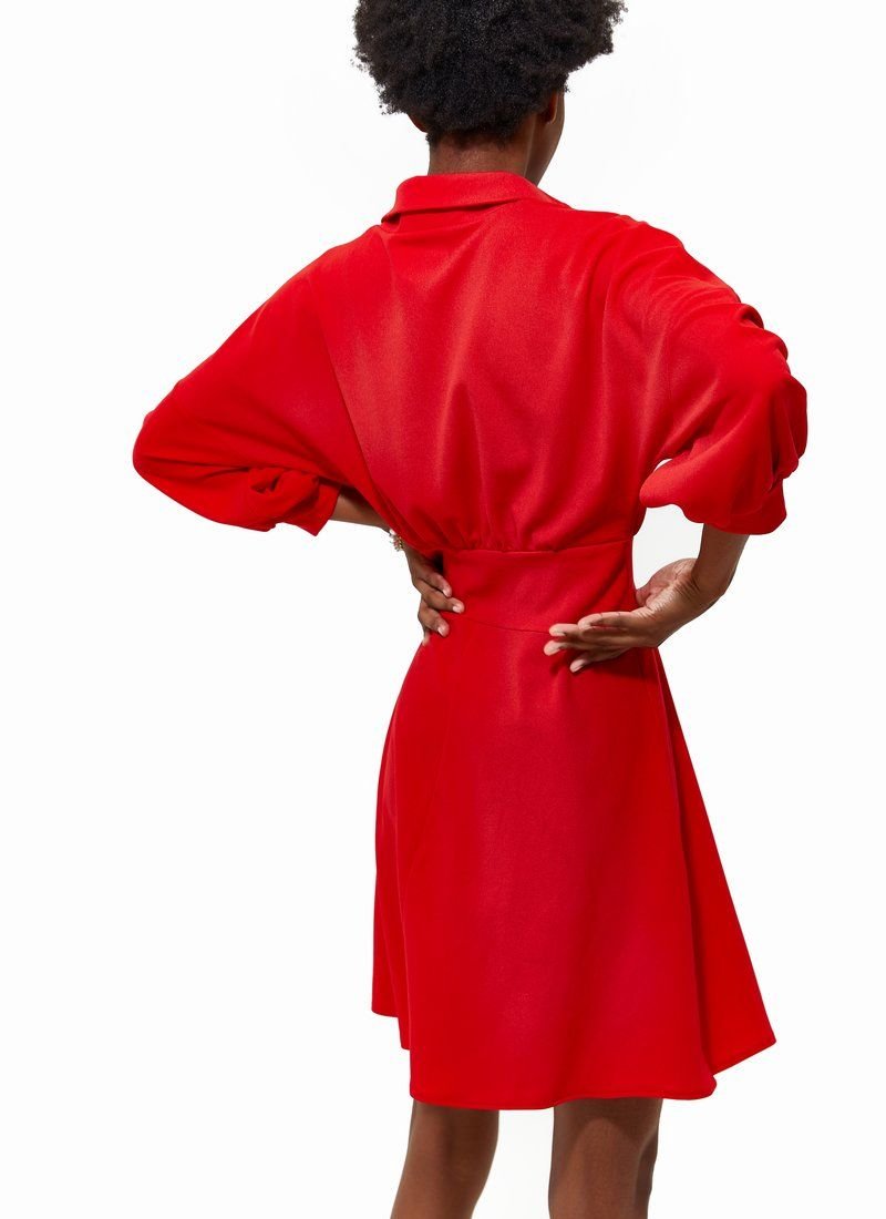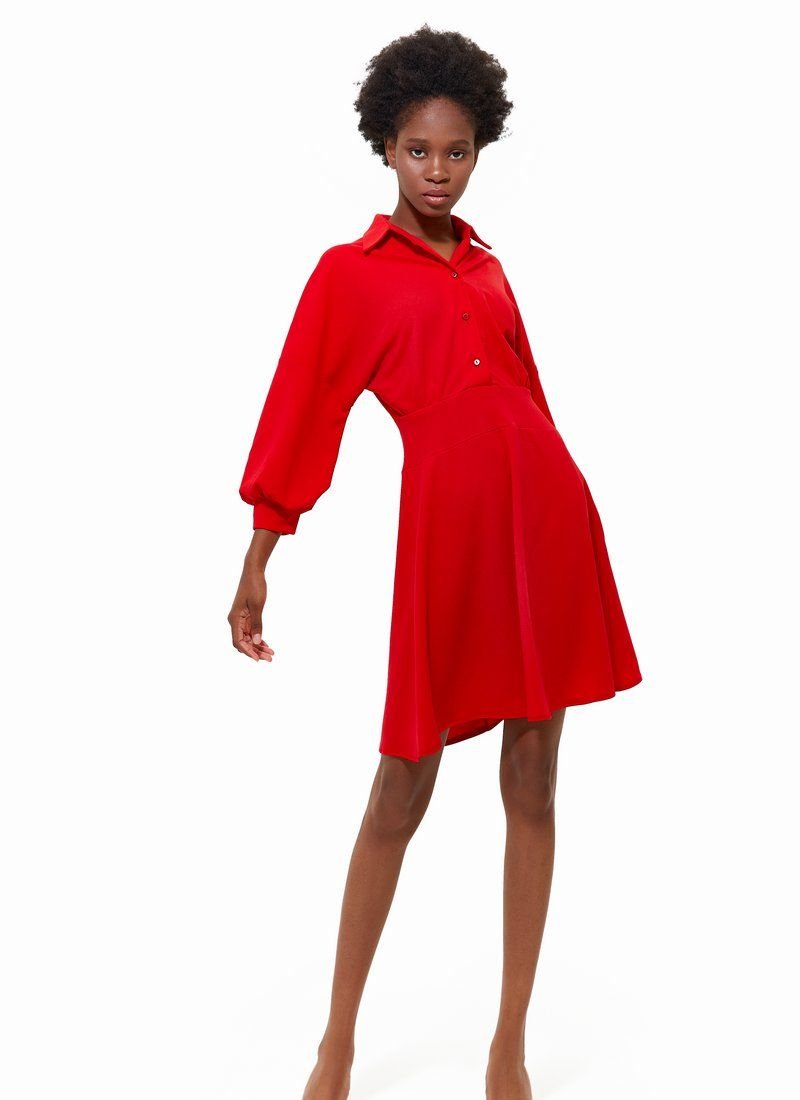 Mini red dress with a turn-down collar, buttoned in front. Cropped loose sleeves with wide cuffs. The dress is perfect for creating everyday images, as well as for going out for the evening.