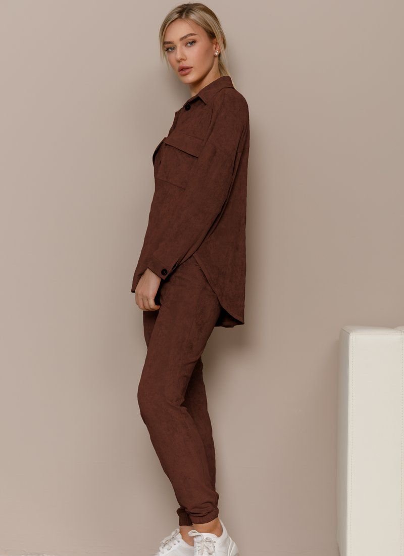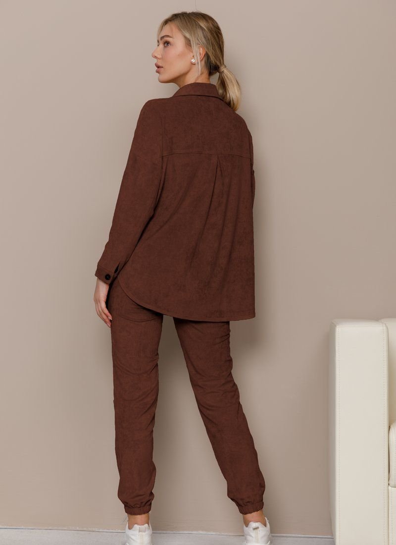 A chocolate-colored suit with an oversize shirt and jogger trousers is made of eco-suede, which has a soft velvet texture. For a comfortable casual look, combine the model with boots or sneakers with massive soles.