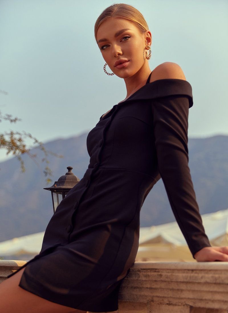 Black mini dress with open shoulders. It fastens with buttons on the front along the entire length. Gepur designers have provided removable straps for your convenience in this model.