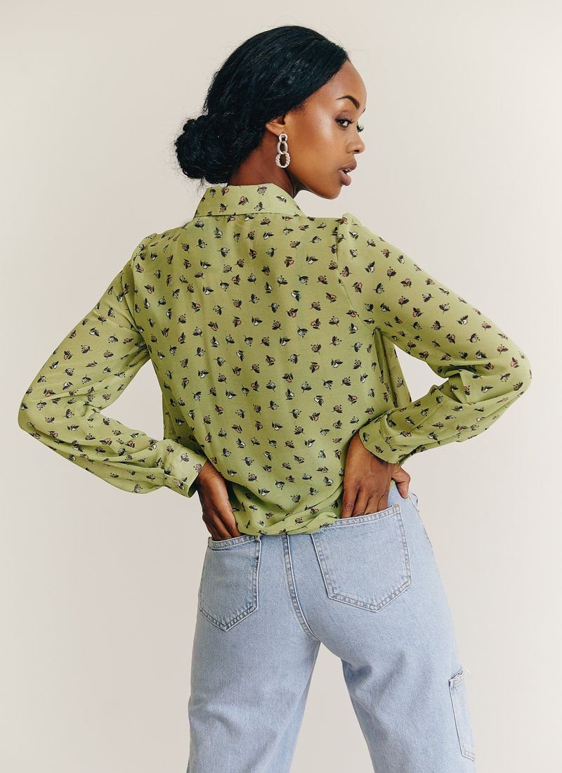 Light chiffon blouse of light green color with a turn-down collar, long sleeves with buttons. It will add brightness to your image and romantic mood due to the floral print.
