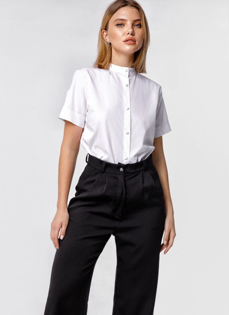 The white blouse looks as romantic as possible. Loose fit with short sleeves. The image can be diluted with a removable collar with layered tulle ruffles.