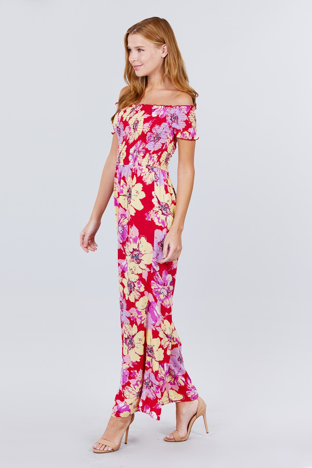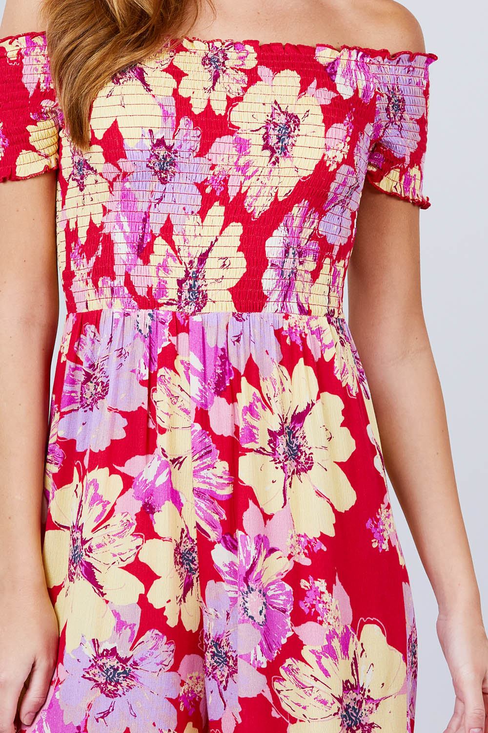 Imported S.M.L SHORT SLEEVE OFF THE SHOULDER SMOCKED DETAIL WITH FLORAL PRINT LONG WIDE LEG JUMPSUIT. 100% Rayon Red ACT