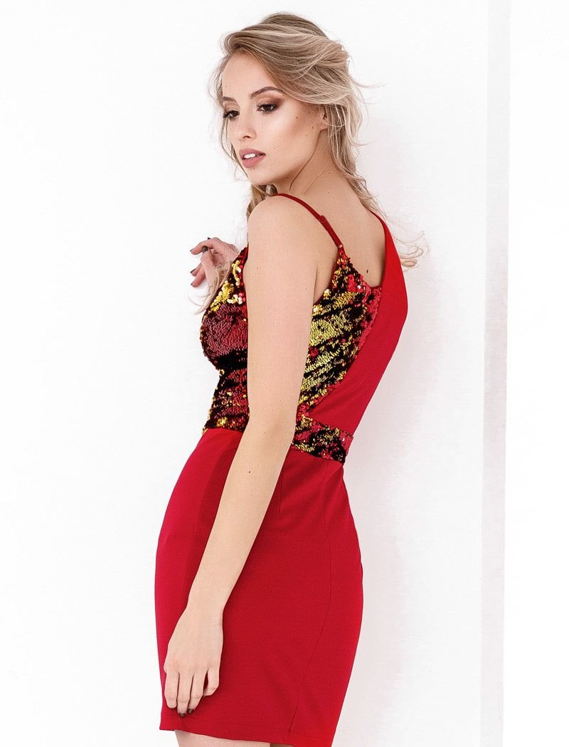 Cocktail dress from Gepur designers, decorated with sequins: a slightly inflated waistline with a sewn-in belt and a combined yoke with a narrow harness.