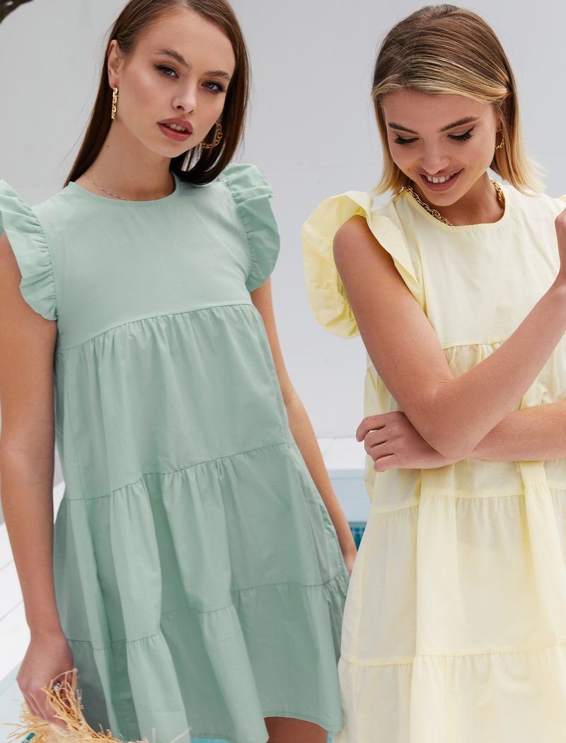 The olive mini dress focuses on comfort: a thin cotton-based material was used for sewing the model with a flared multi-tiered hem. Wing sleeves support the airiness of the image.