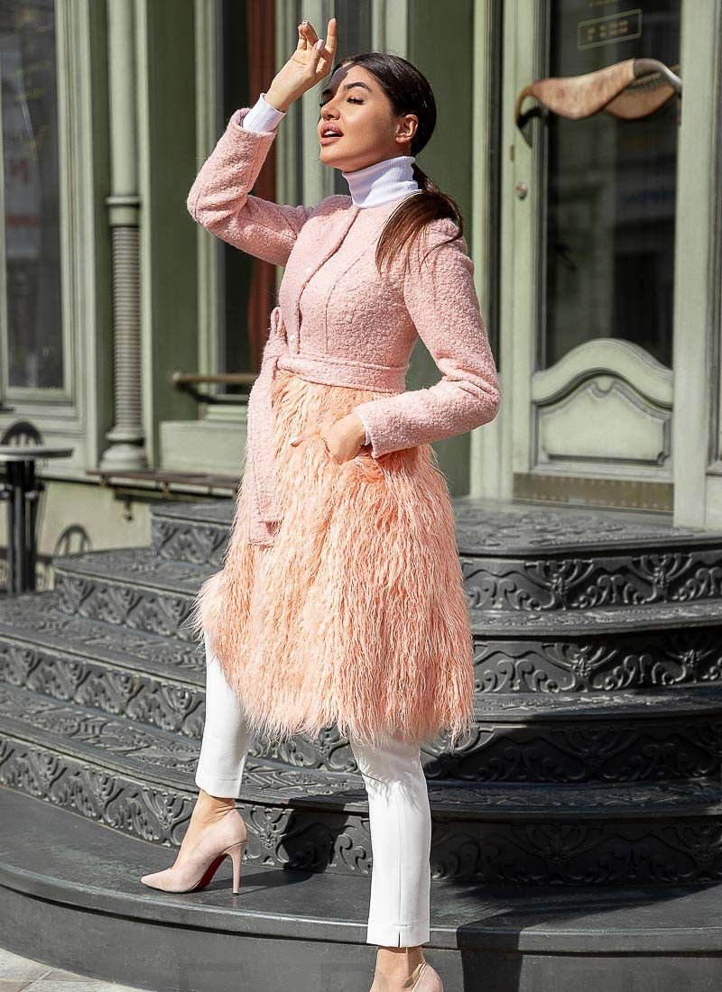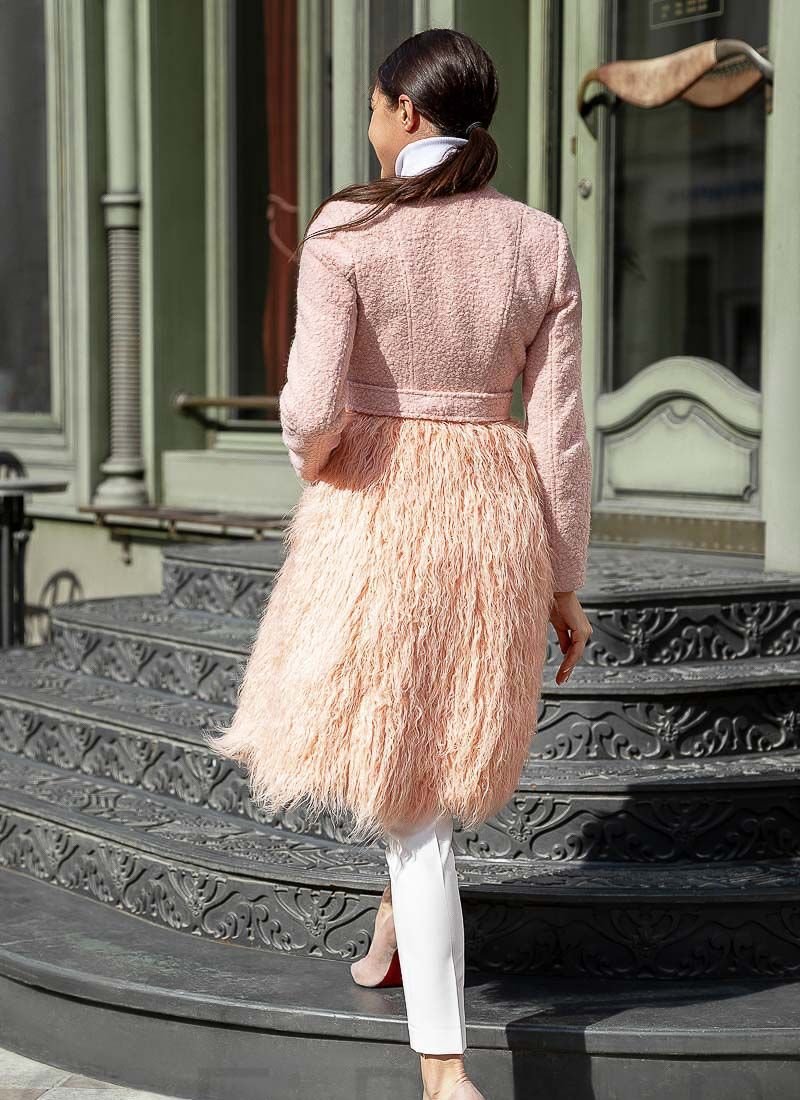 An elegant coat from Gepur designers, made of premium-grade coat fabric: an original cut that repeats the female silhouette, a slightly inflated waistline, a sewn-on hem made of eco-fur and a removable belt to match.