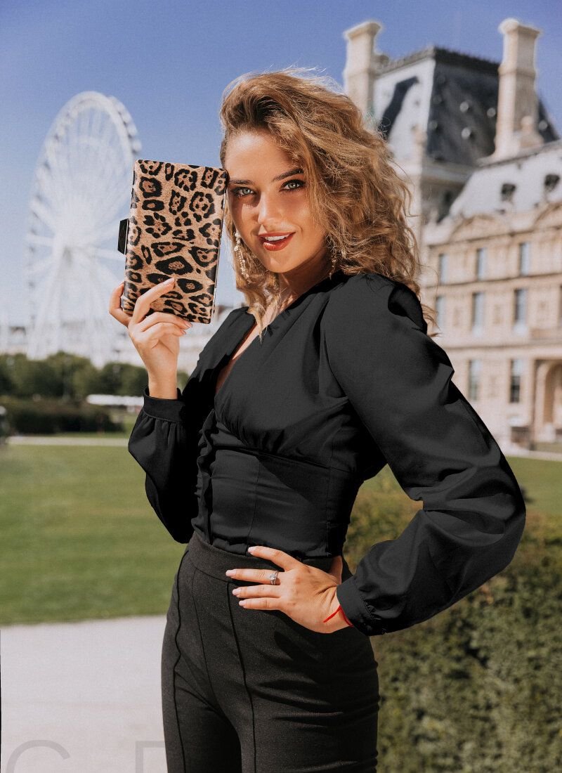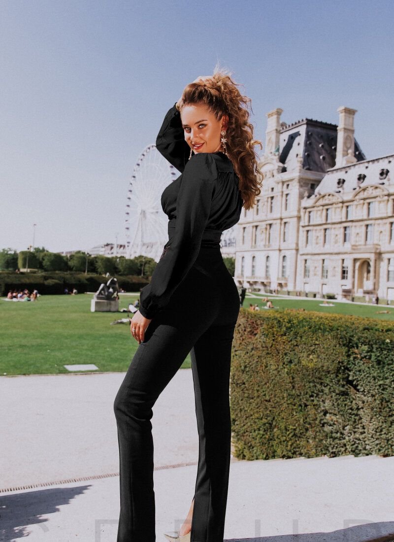 An exquisite black blouse made of delicate silk fabric created by Gepur designers: fitted cut, deep v-neck, long voluminous sleeve, button placket in front, light drapery that helps to correctly place accents in the image.