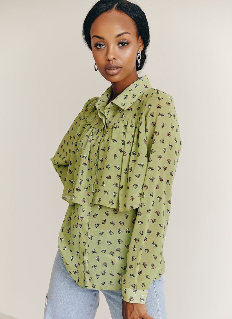 Light chiffon blouse of light green color with a turn-down collar, long sleeves with buttons. It will add brightness to your image and romantic mood due to the floral print.