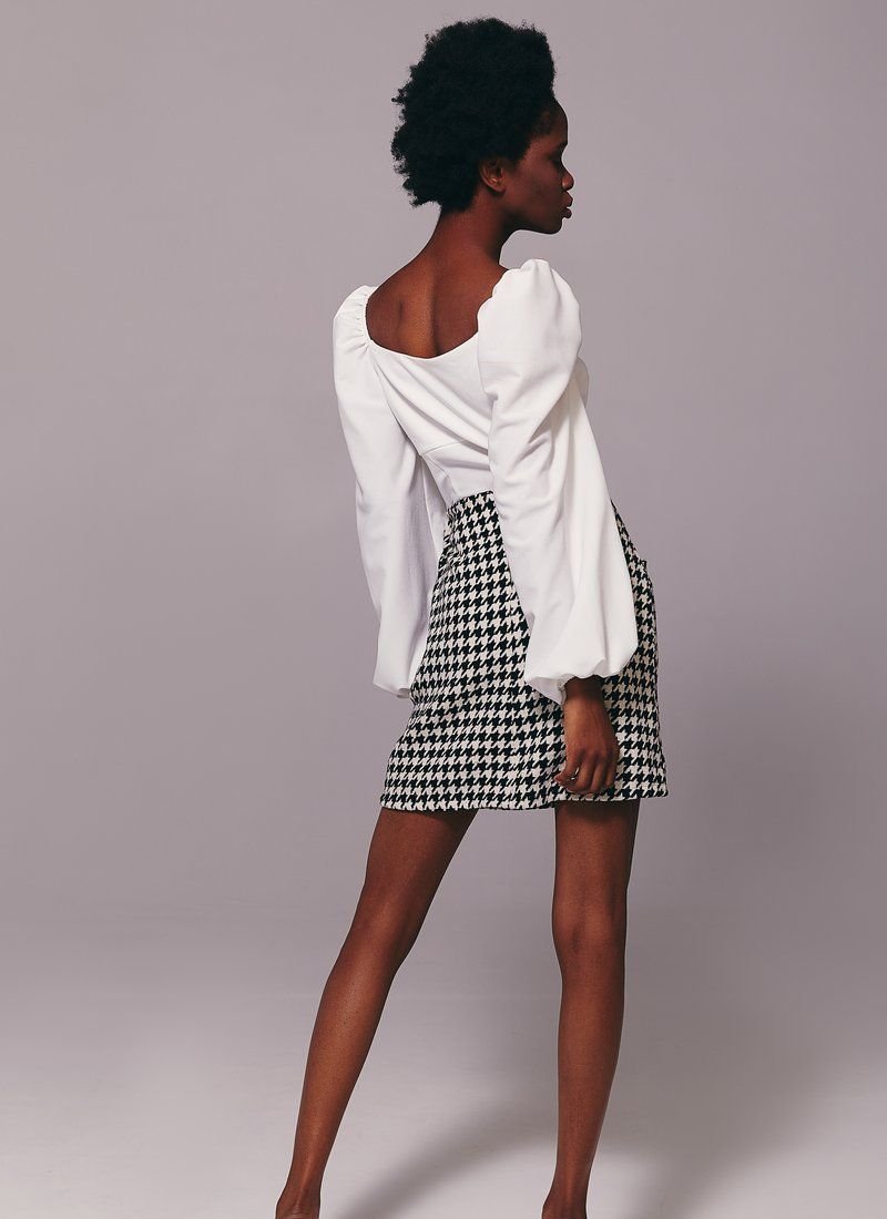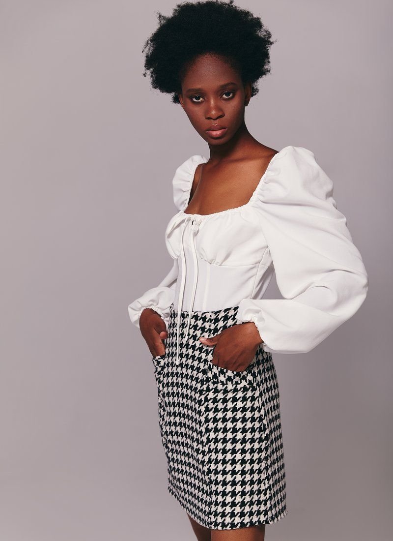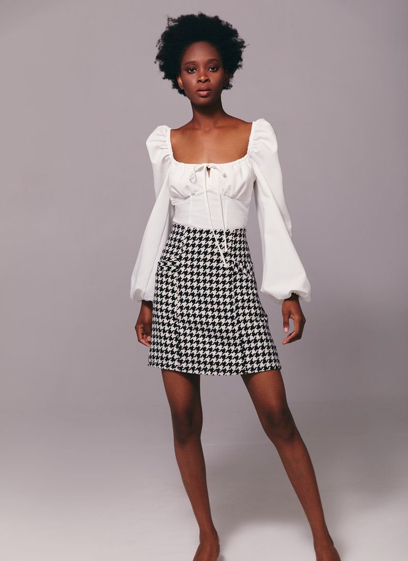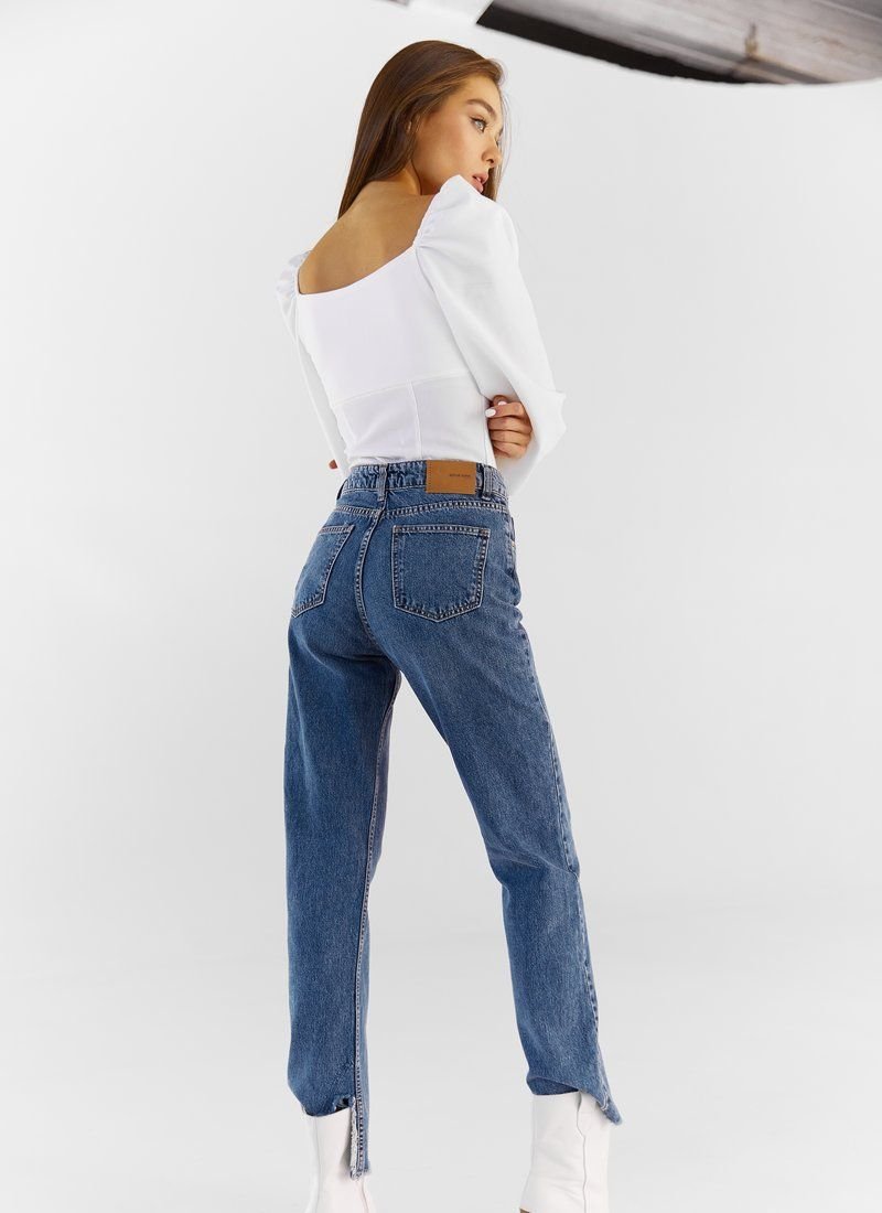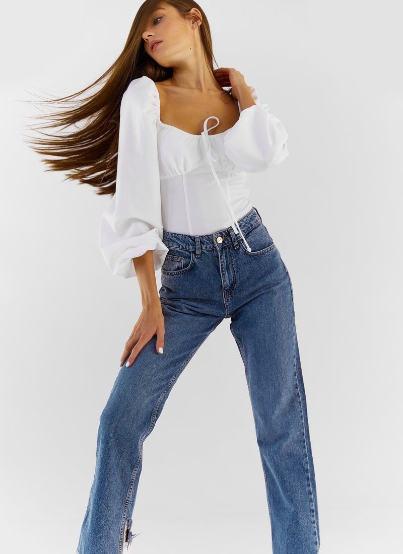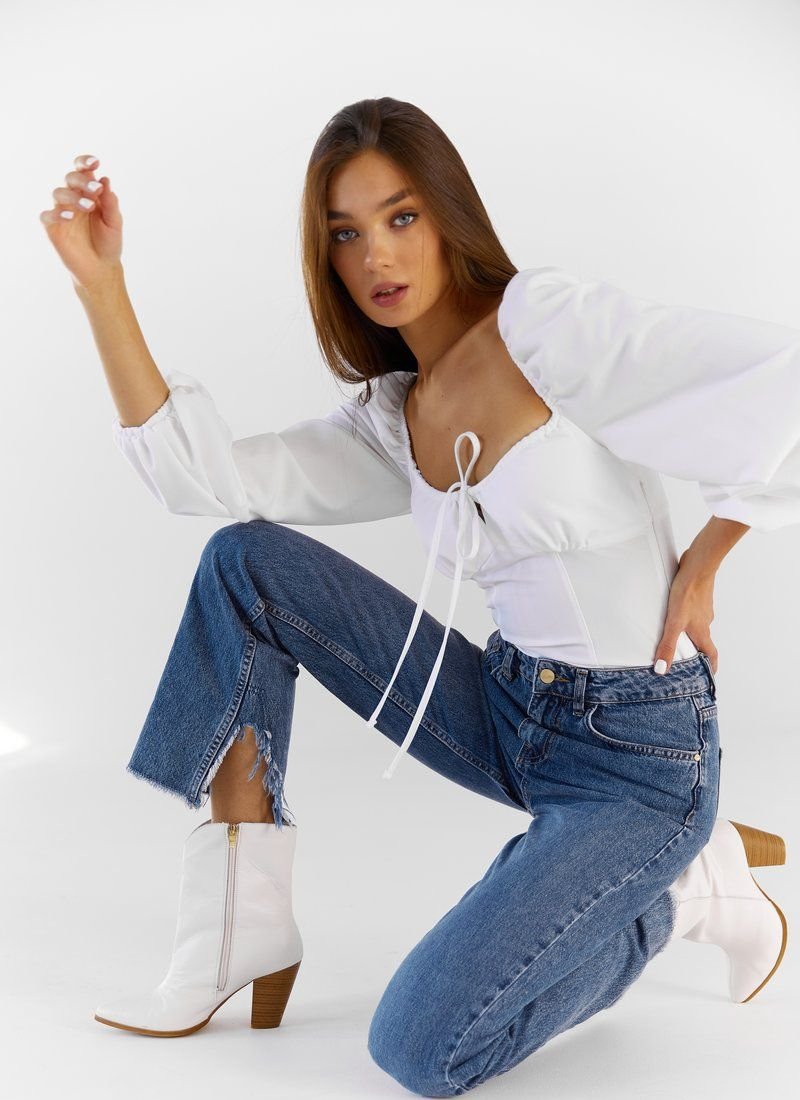 Milk bodysuit with ties with trendy lantern sleeves. The sleeves have an elastic insert, which allows them to be worn on the shoulders, or worn with open shoulders. This body is perfect for both everyday looks and for an evening out.