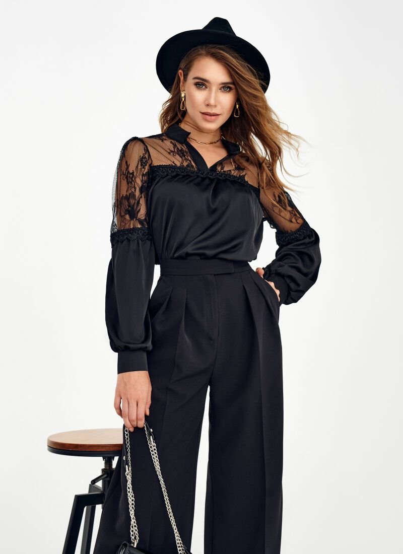 Despite the black color, the blouse does not look strict. It's all about a translucent yoke of fine lace. The connection lines of the openwork part with the main material were also decorated with lace details. The loose cut and light silk of the product provide comfort.