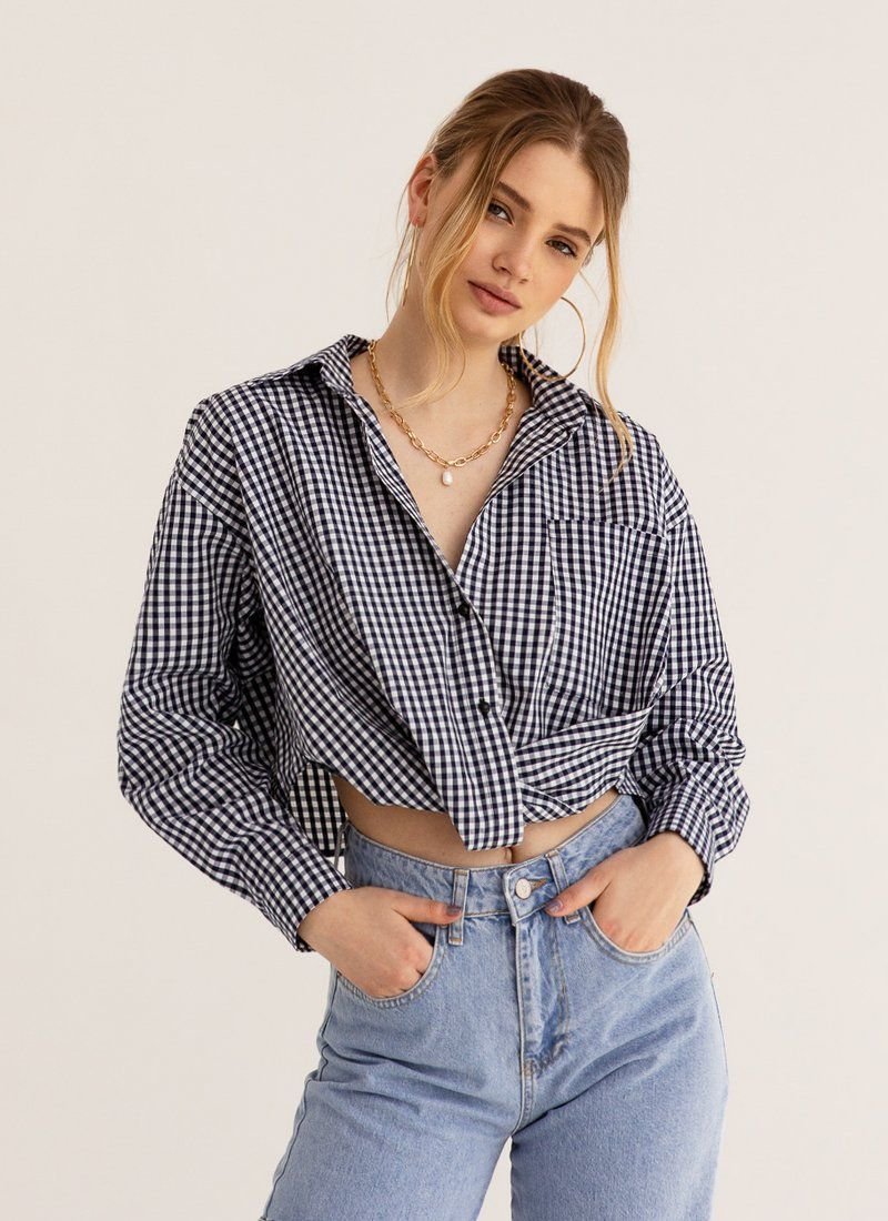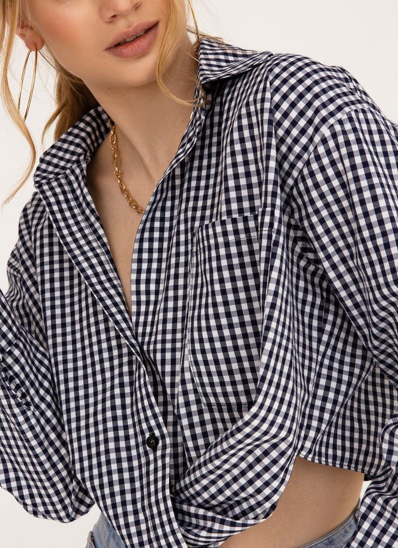 A loose shirt looks quite informal. It's all about the checkered print and the cut with the original overlap on the bottom edge. The model will harmoniously complement the casual look with jeans and mules.