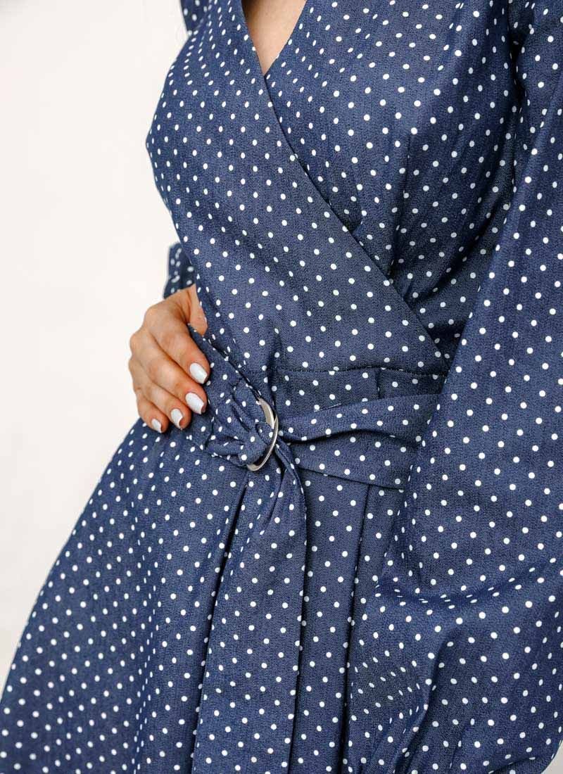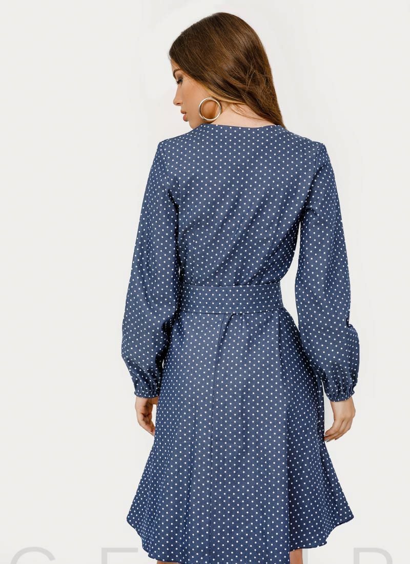 A classic midi dress in a pea print: a deep v-neck, a fixed smell, a long voluminous sleeve with an elastic cuff, a cut-off waist and a half-sun skirt, complemented by a removable belt with a metal buckle.