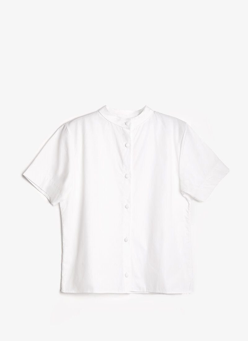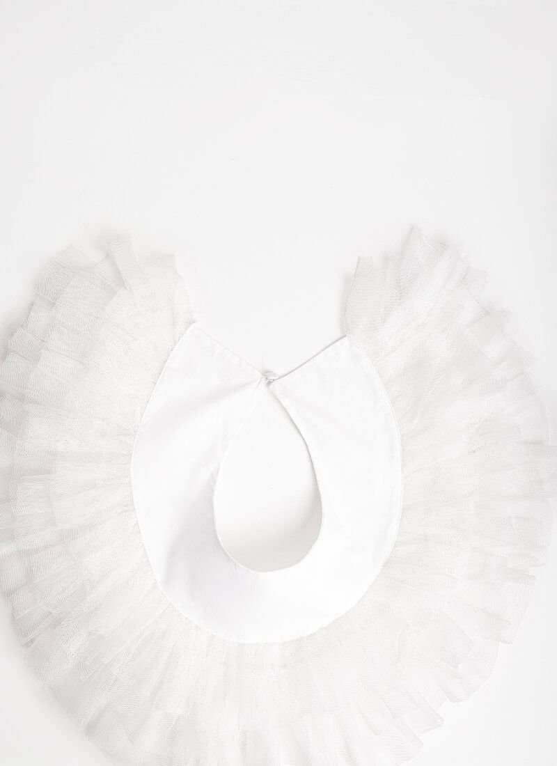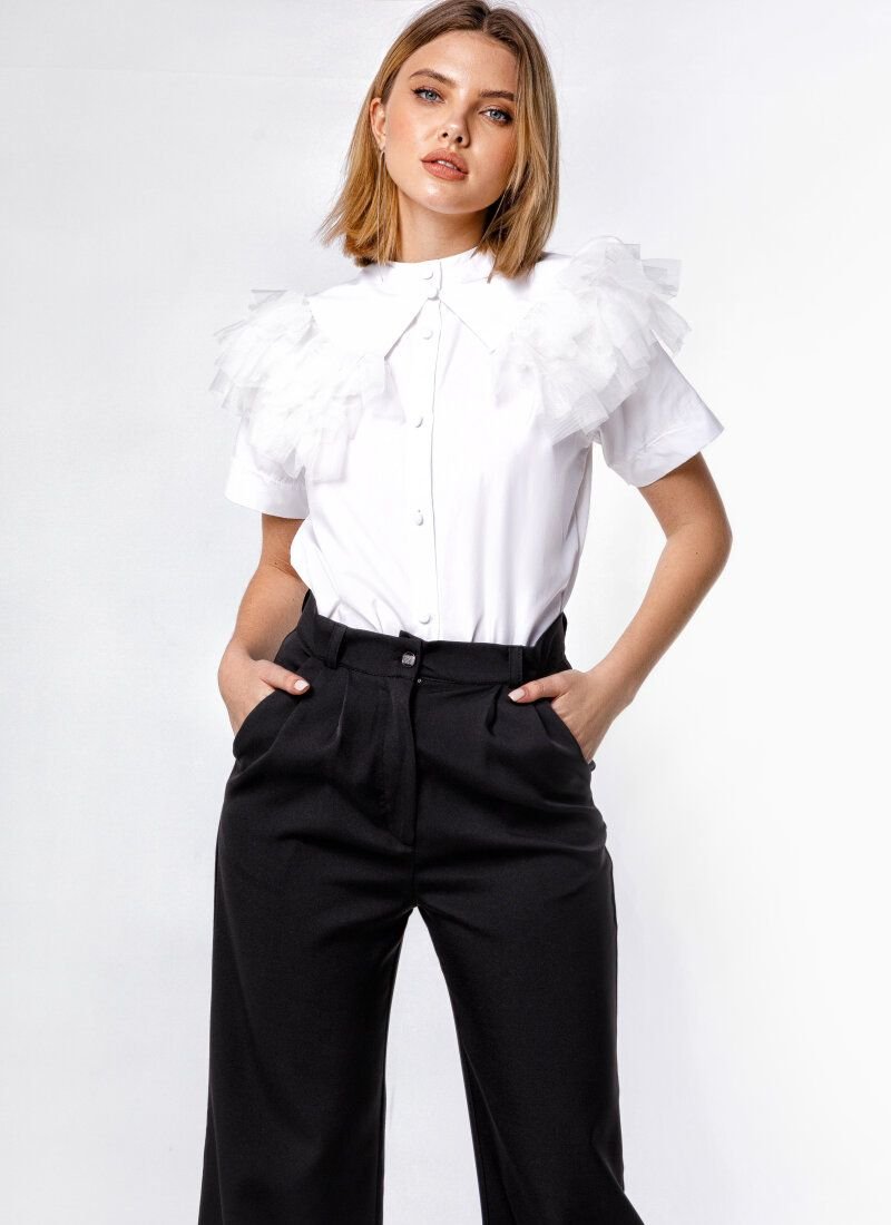 The white blouse looks as romantic as possible. Loose fit with short sleeves. The image can be diluted with a removable collar with layered tulle ruffles.