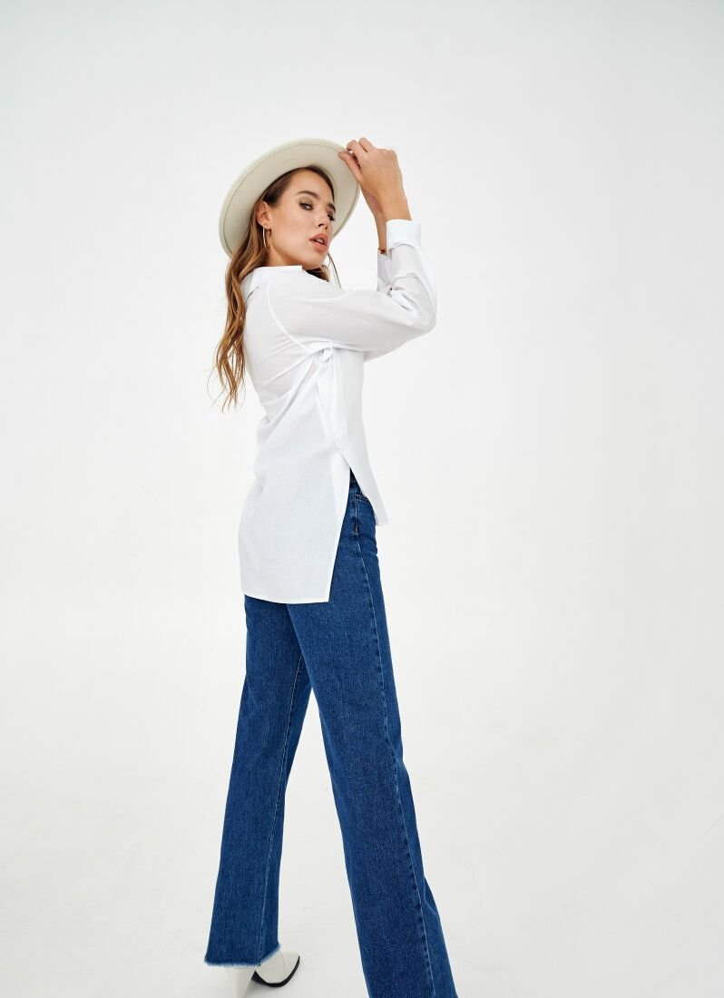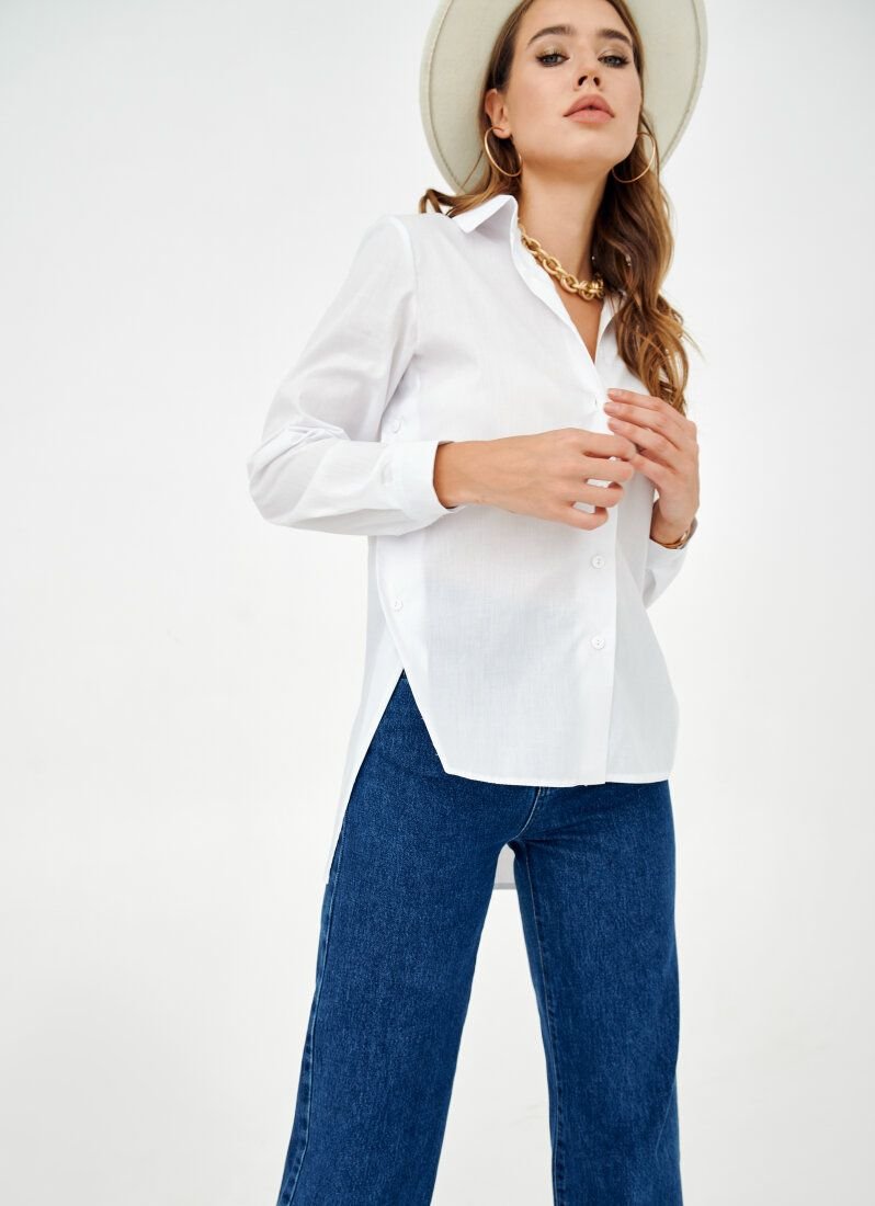 Stylish cotton shirt of asymmetrical cut: neat turn-down collar, long sleeve with cuff, elongated back and side slits with button closure.