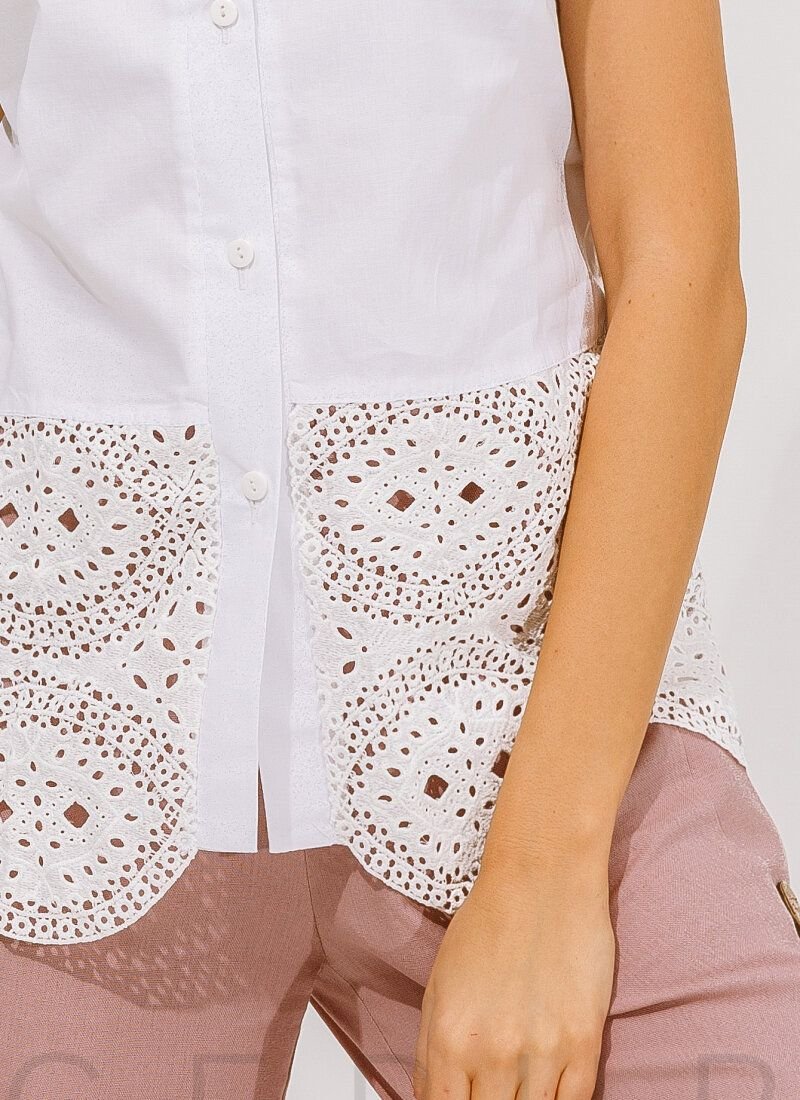 Sophisticated white blouse with embroidery on the bottom edge. Round neck, button placket in front and straight cut.
