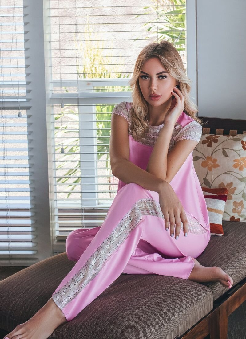 Pajamas of a delicate pink shade are made of soft silk fabric that is in no way inferior to its natural counterpart. Spacious straight-cut trousers are complemented by an elastic waistband, which is responsible for a comfortable fit at the waist. And the blouse, which is pleasant to the body, is complemented by a delicate lace decor.