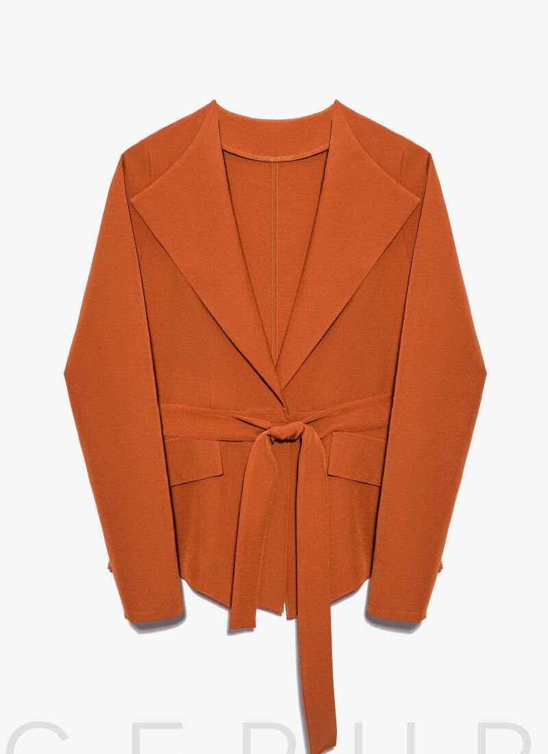 Business suit of terracotta shade. Fitted blazer for the smell with lapels, long sleeves, pockets-deceptions and a removable belt. Trousers with a narrow cut and a high fit.