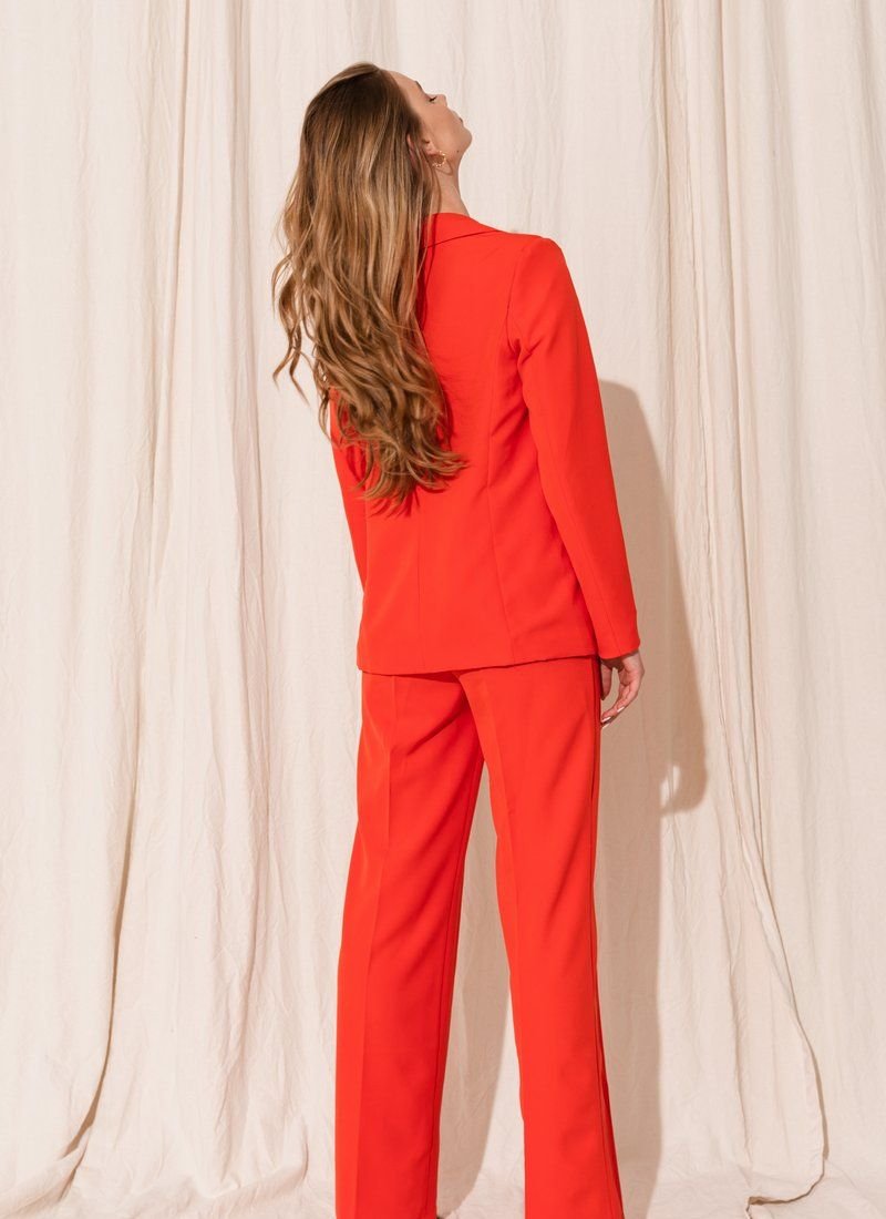 The classic suit of straight trousers and a single-breasted jacket only benefited from a bright red shade, unusual for such products. The color will help to diversify the range of the wardrobe in a business style. The trousers are complemented by an elastic waistband and fixed arrows, and the jacket has welt pockets.