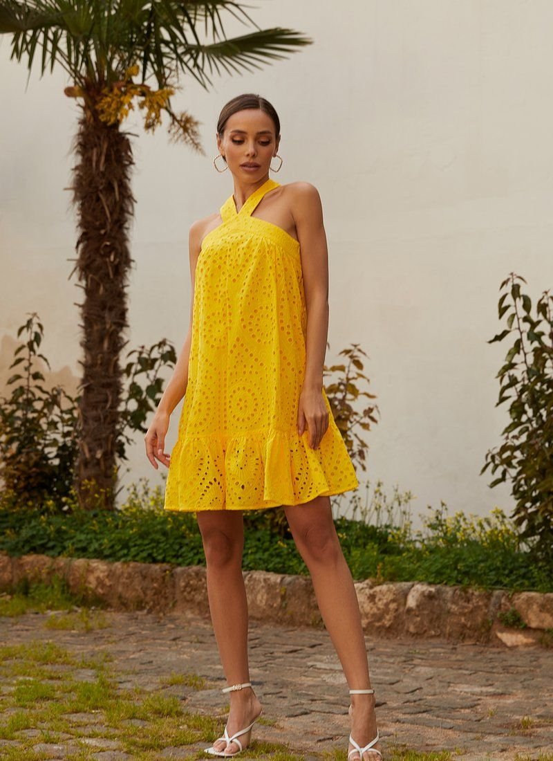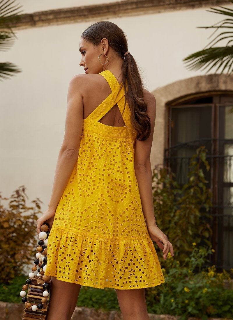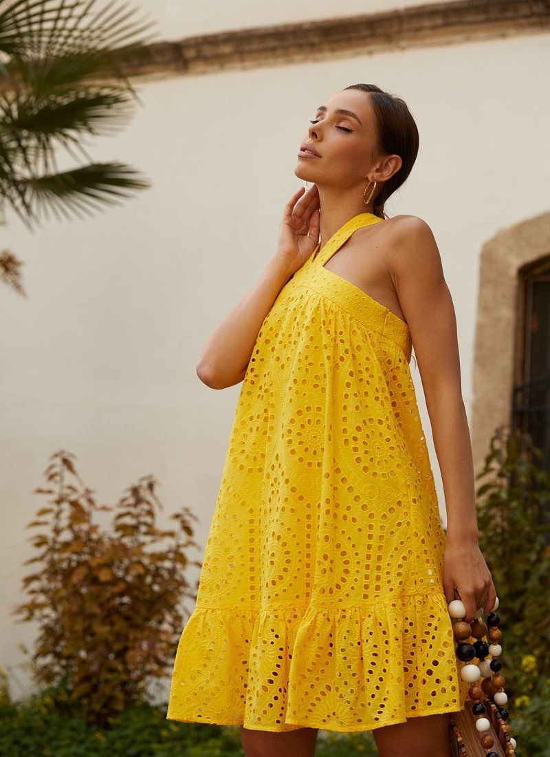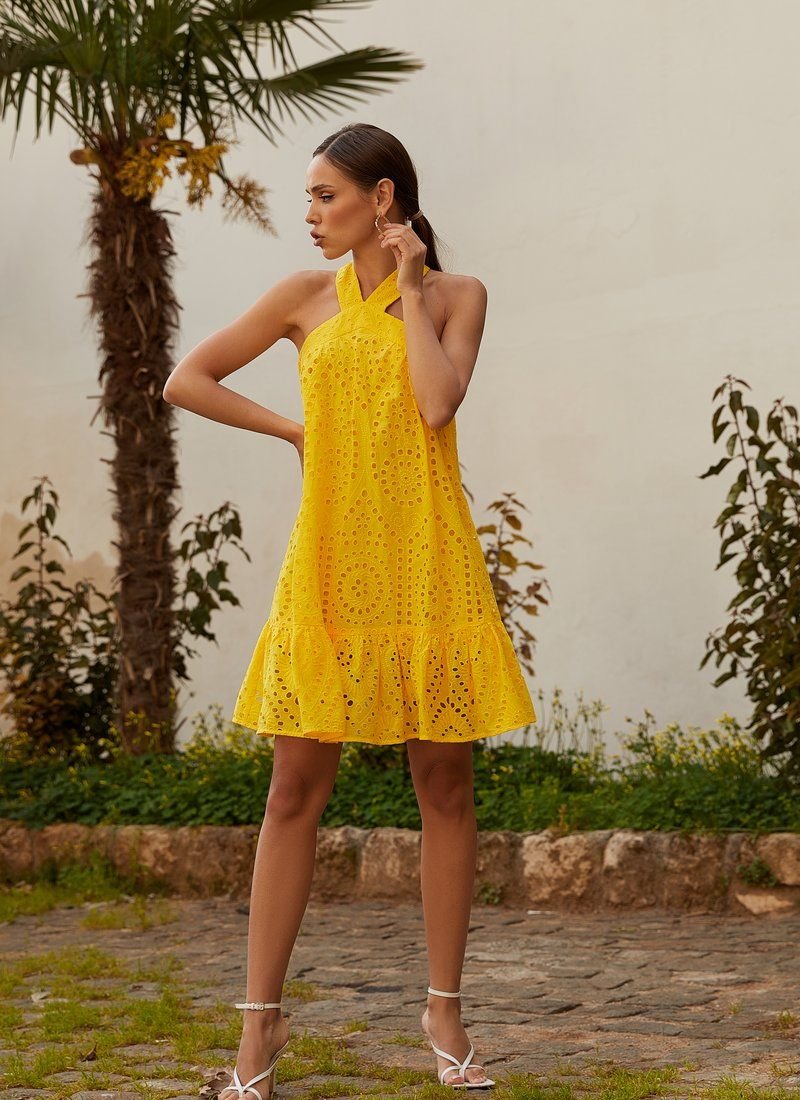 In the 2021 season, halter tops returned to the catwalks - tops with a strap thrown over the neck. A yellow mini dress with cross straps on the back supports this trend. The model is sewn from openwork material with embroidery. The loose cut was supplemented with a flounce at the hem.