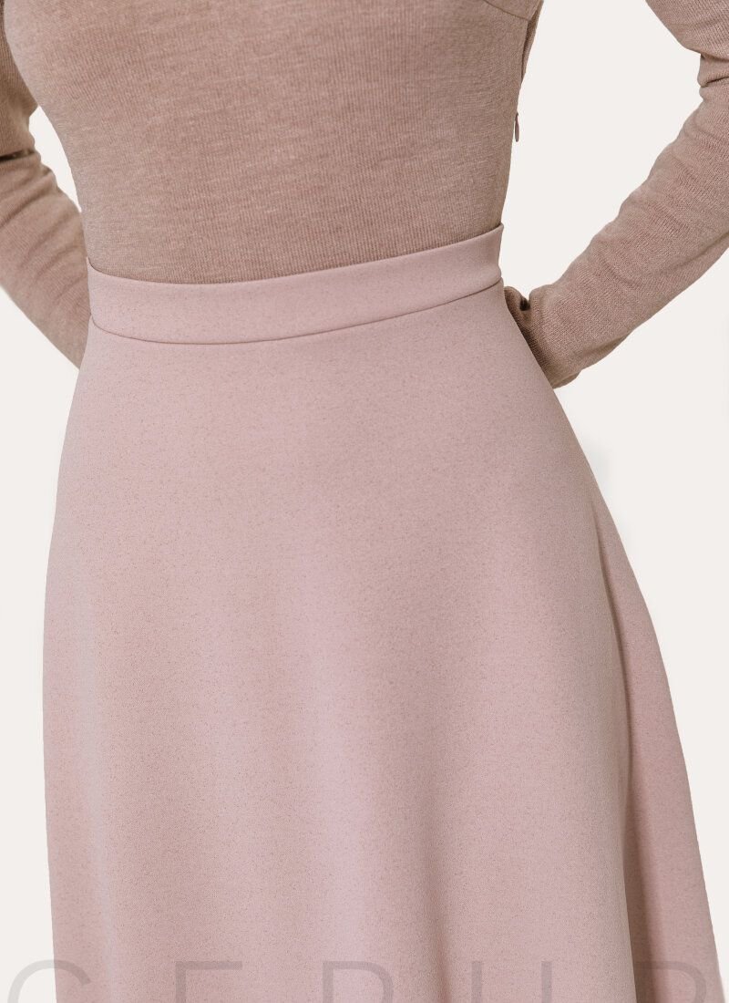 Midi dress in a delicate shade: knitted top, v-neck, long sleeve, waistband and flared skirt.