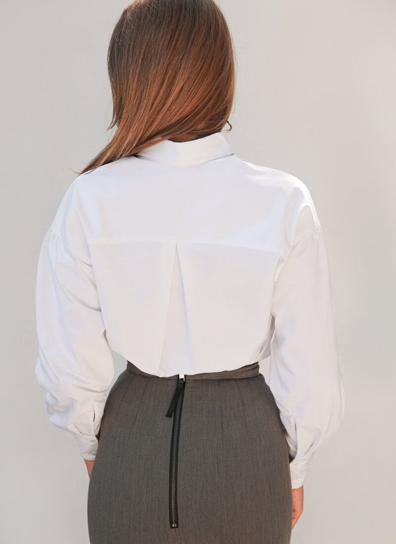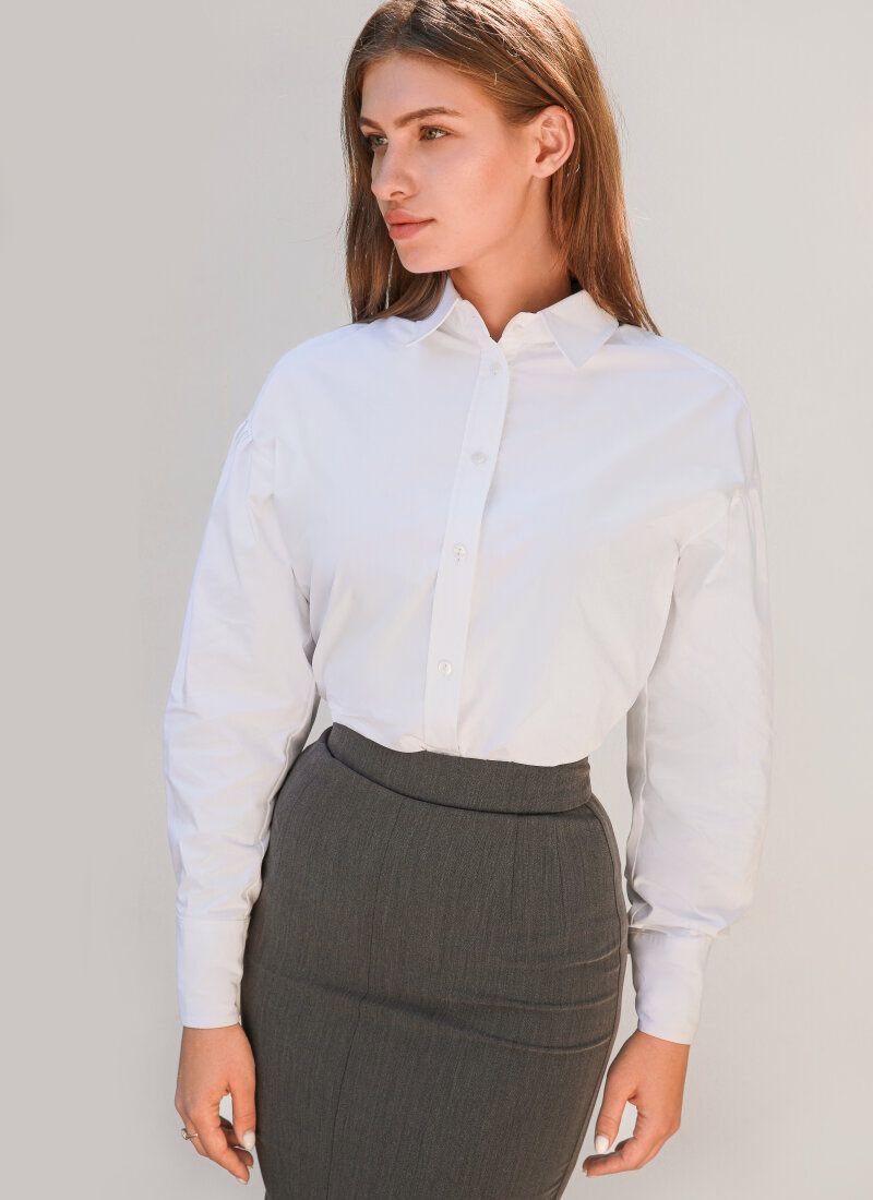 A basic white shirt from Gepur designers. The model with a turn-down collar is complemented by puffy sleeves on wide cuffs. The collection was presented by Misha Romanova, a solo artist and ex-member of the legendary VIA Gra group.