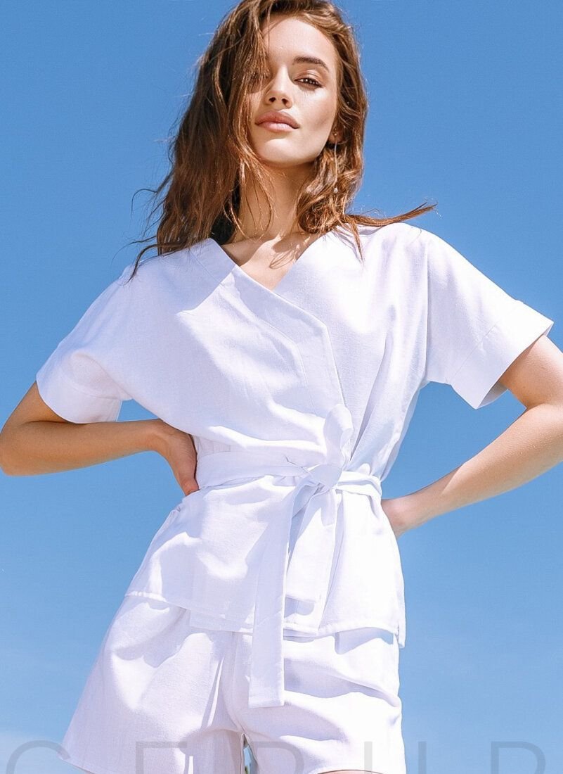 Breathable linen suit in white. Loose shorts with an elastic waistband and a short-sleeve shirt for the smell. The set includes a removable fabric belt to match.