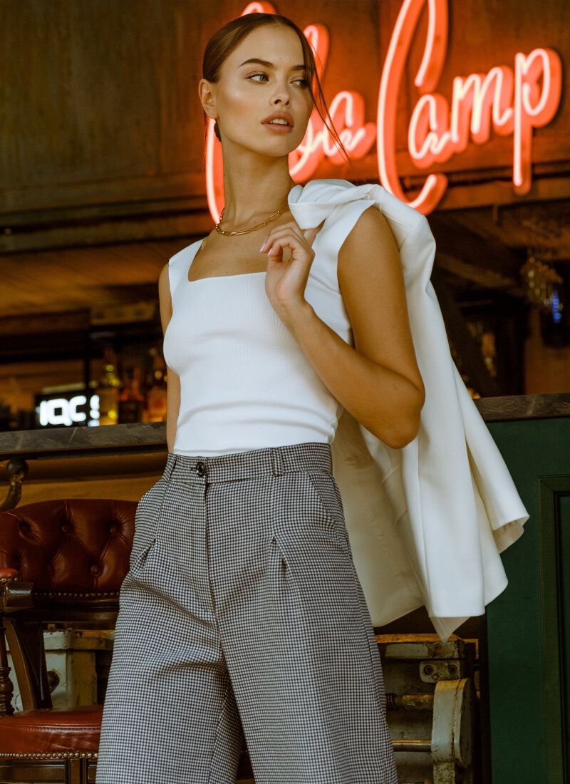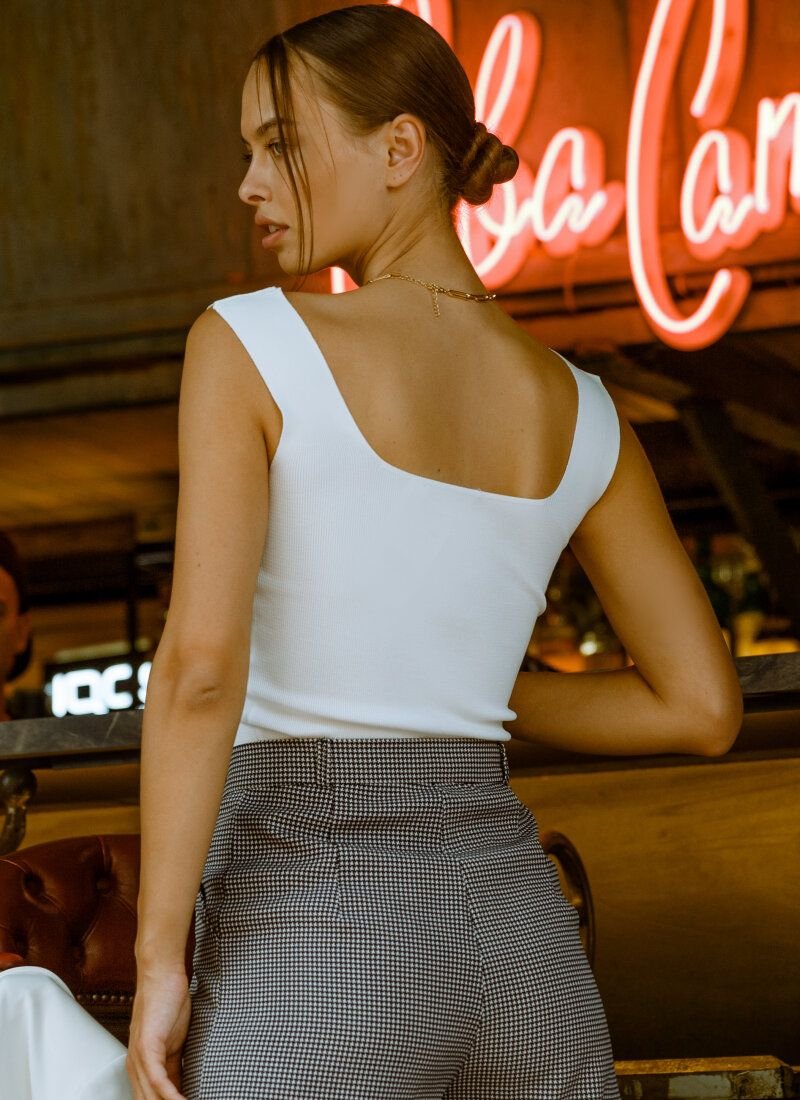 A white T-shirt will easily complement the everyday look, it is enough to choose the right company for it. The main decoration of the product is a fine hem, characteristic of knitted material. The model is complemented by one-piece wide straps and a square neckline.