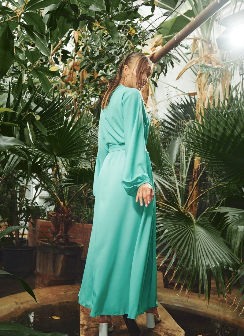 A loose tunic will inevitably attract attention due to the bright shade of aquamarine. The model was sewn from chiffon material. The comfort of the landing can be adjusted with a belt-ribbon.