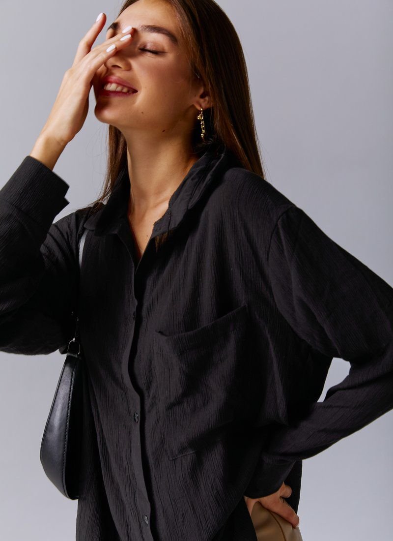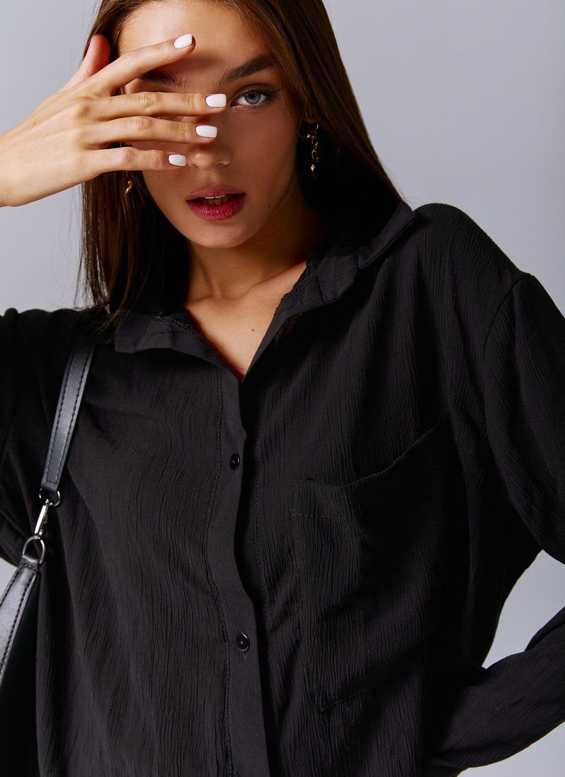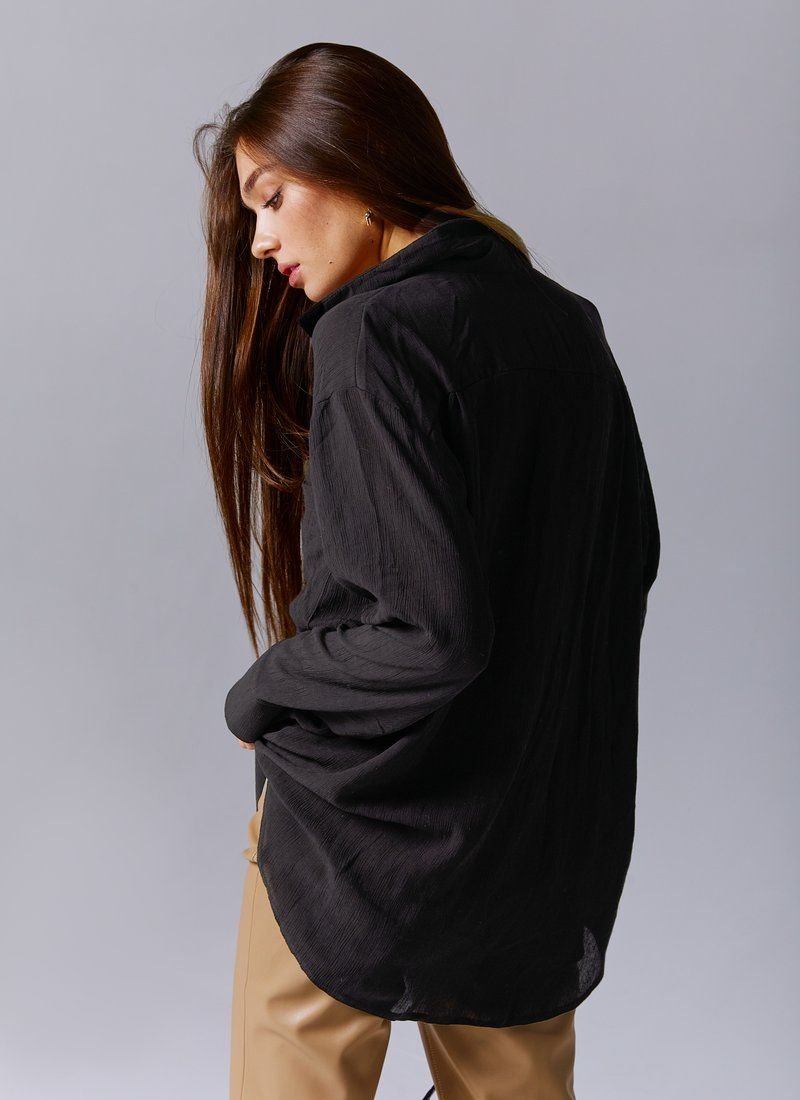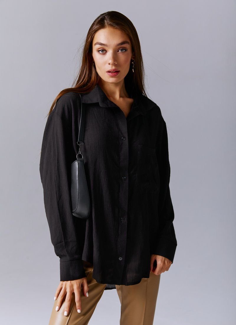 The classic black shirt is made of a chiffon header material. The model is cut oversize, long sleeves at the cuffs, buttons in front, turn-down collar. The shirt can be worn both with trousers and jeans, as a separate element, or in combination with tops or jumpers.