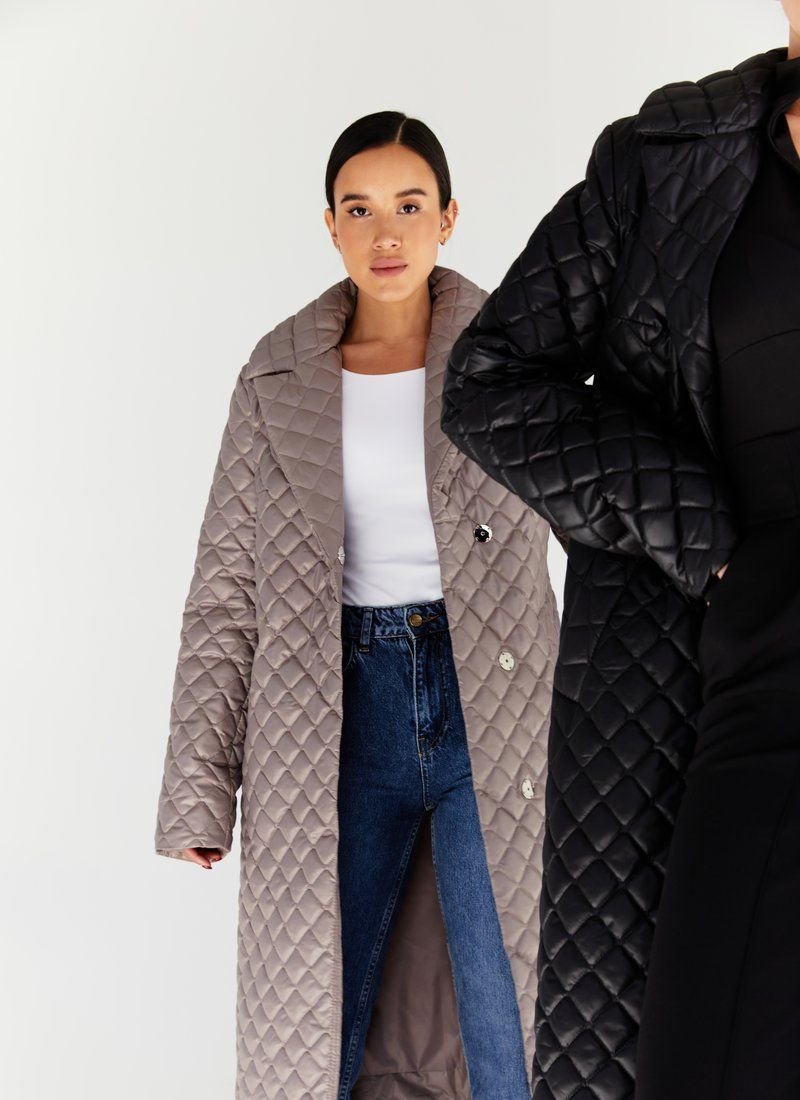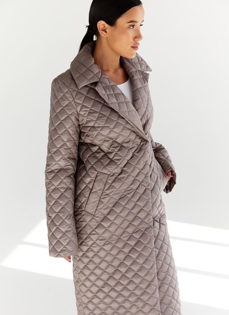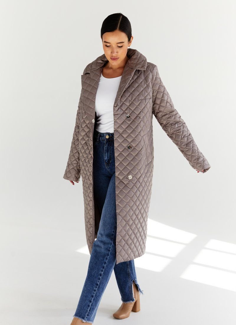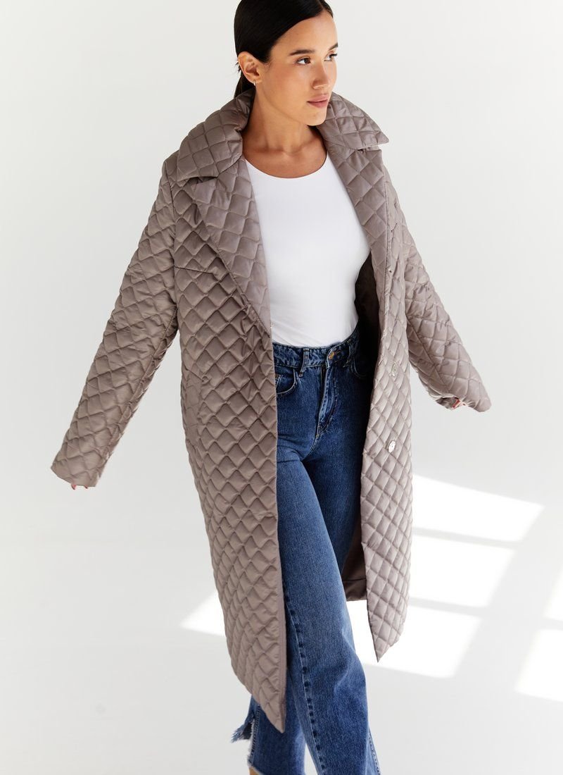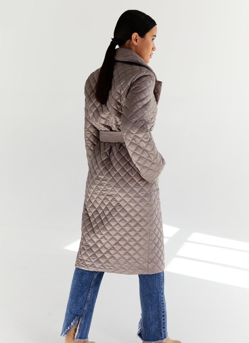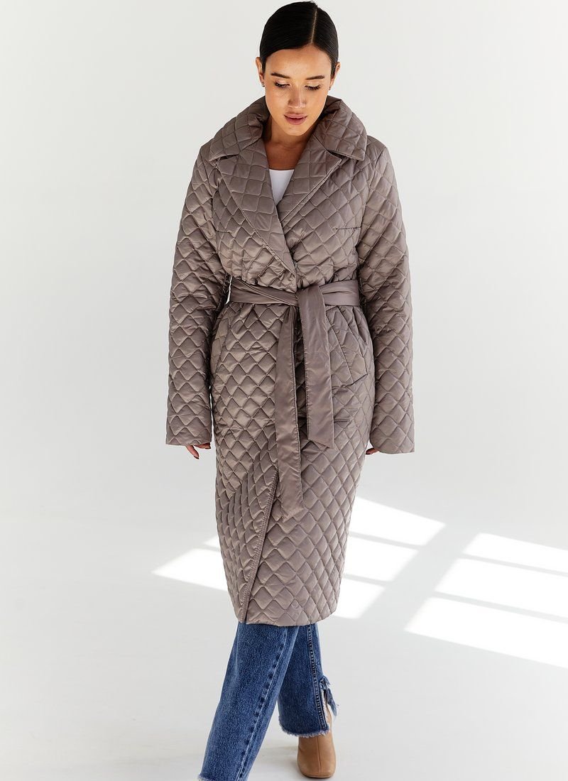 Quilted coat with a ribbon belt in a cappuccino color set, stylized with lapels, buttons. Quilted models have become a hit of the FW 2021/22 season. In their collections, this trend was supported by such fashion houses as Max Mara, Barbara Bui and Dior. Features: the role of insulation is sintepon (80 g/m2). Please note that the product is designed for temperatures up to +10 ° C.