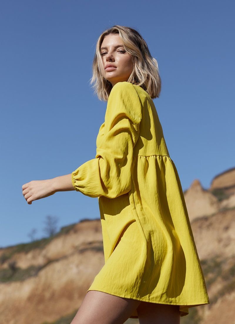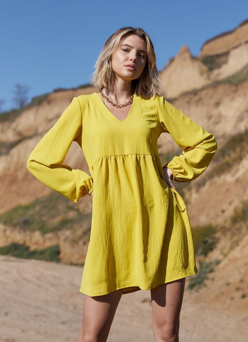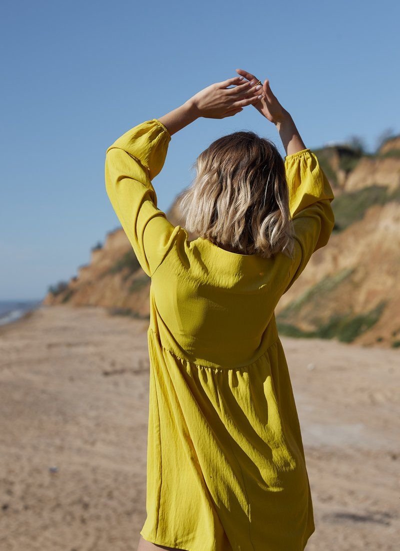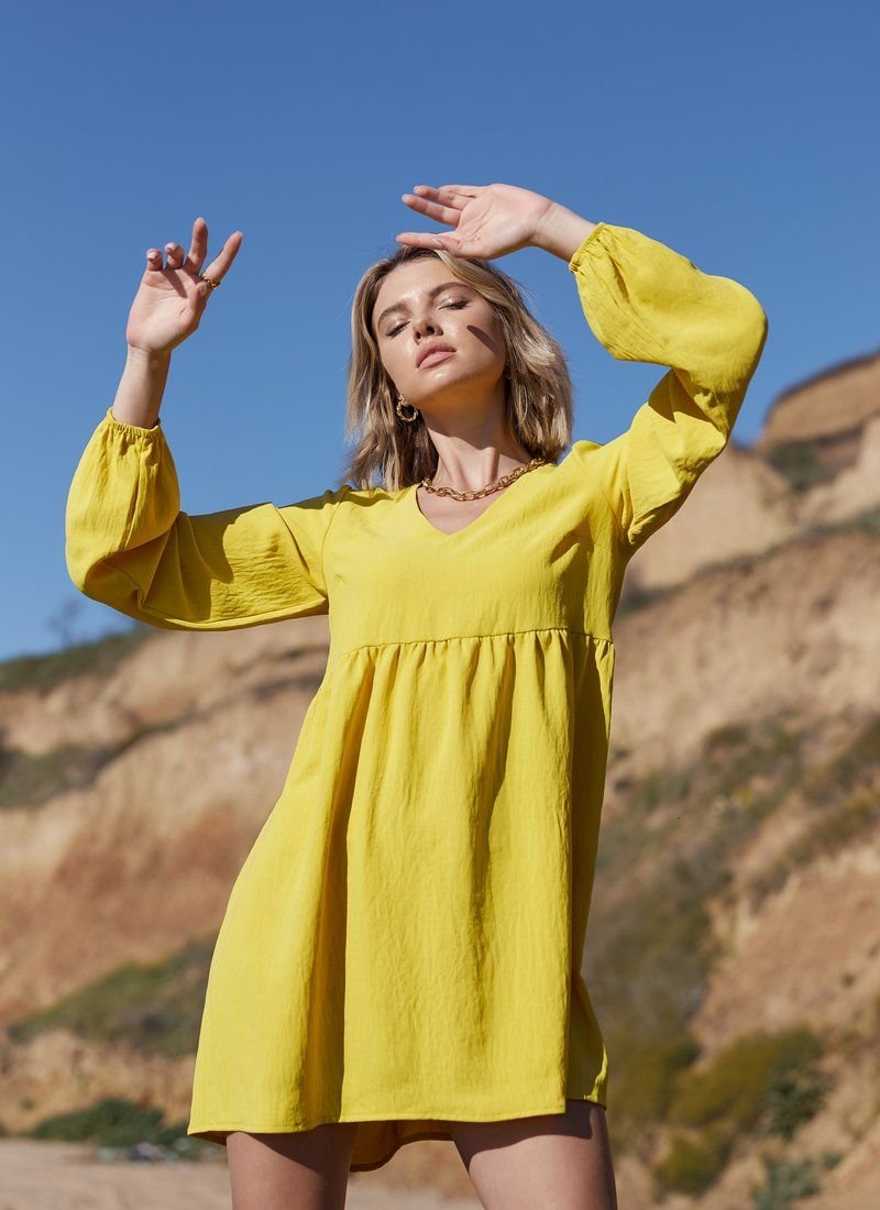 A dress made of light cotton material will look organically with ballet flats and sneakers. For versatility, things work both a monochrome mustard color and a laconic cut with an inflated waistline, v-neck and long sleeves.