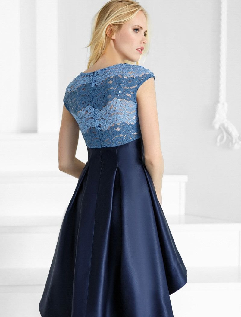 A cocktail dress from Gepur designers, with a colored guipure yoke, a neat short sleeve and an asymmetric skirt made of royal satin, forming a soft cascade. .