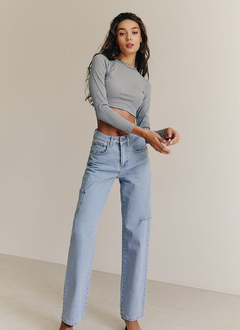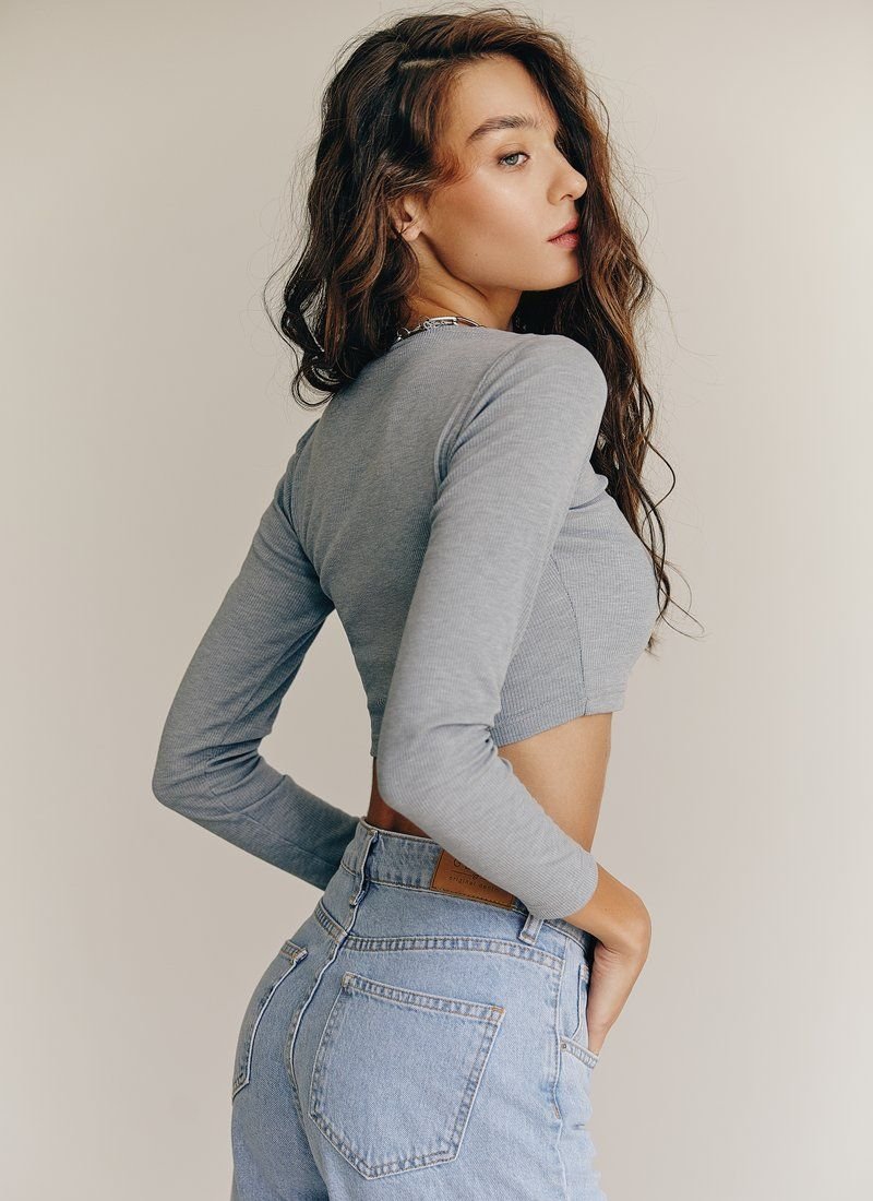 Cropped gray ribbed longsleeve with a round neck. Knitted fabric, long fitting sleeve.