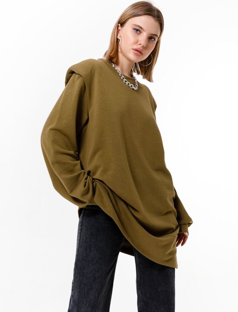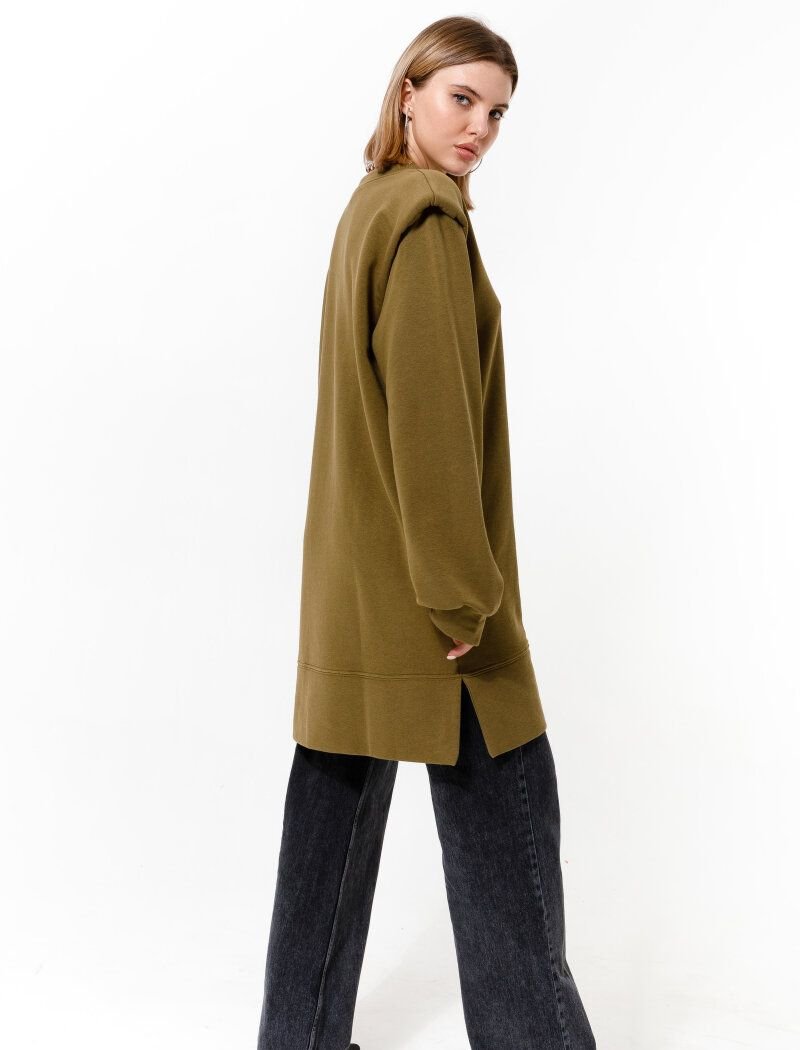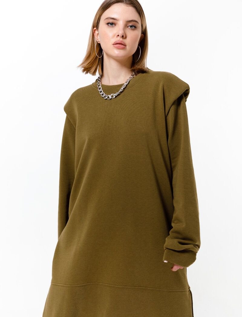 A loose olive dress will become a comfortable basis for a casual look. For example, adding a bomber jacket and boots with a massive sole. The solid-color model is made of soft cotton knitwear with the addition of stretch fibers. A product made of such a material fits nicely to the body and does not restrict movement. The trendy cut with an accent line of the shoulders is formed with the help of foam inserts. The wide lower edge is complemented by side slits.