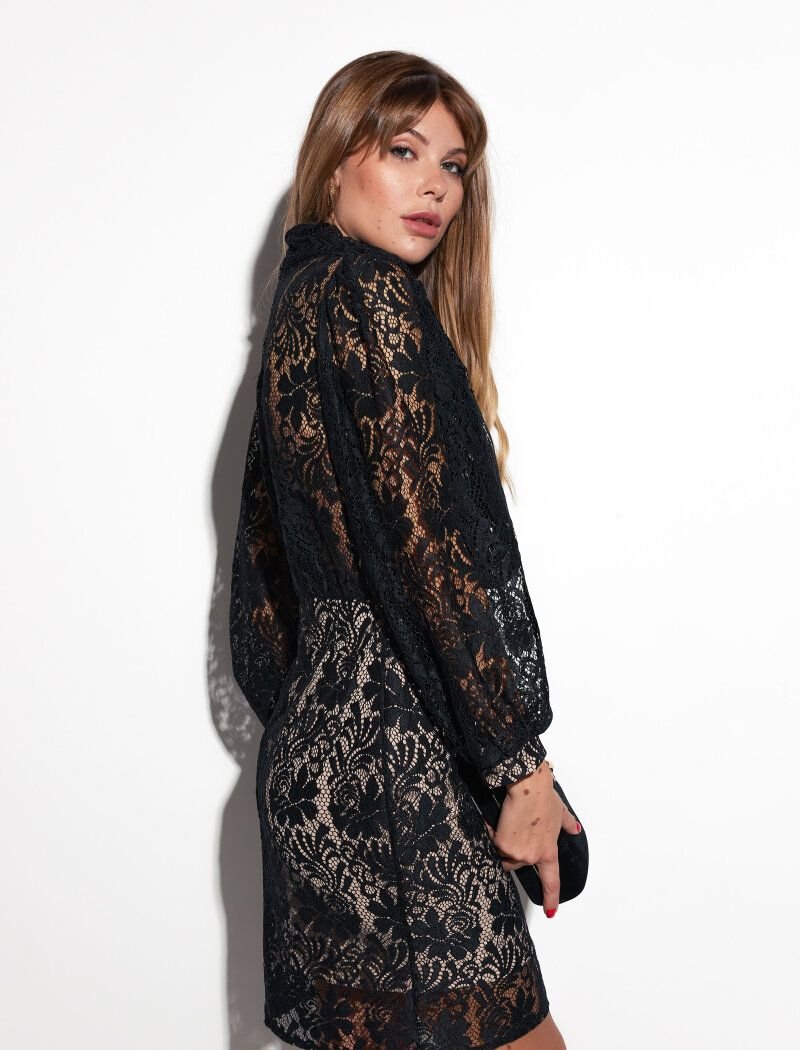 Openwork lace with a floral motif is responsible for the formation of a bright temperament of the model. Semi-transparent voluminous sleeves with cuffs add femininity to the dress. A stand-up collar and a tight mini skirt complete the sophisticated look. The product also complements the beige lining. The collection was presented by the popular Instagram blogger and It-girl-Yulianna Yussef.