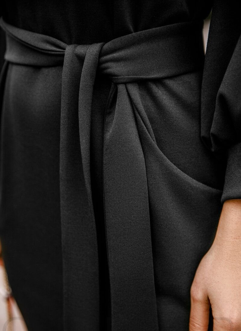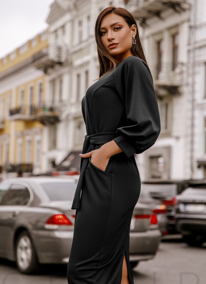 A fitted midi dress in black, made of elastic Italian knitwear: round neck, one-piece voluminous sleeves on a wide cuff, modeling recesses, two side pockets in the seams, a straight-cut skirt with a slit in the back, complemented by a removable plain belt.