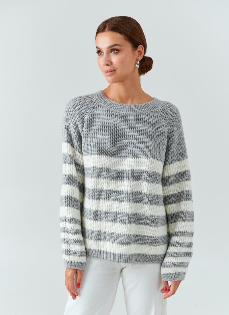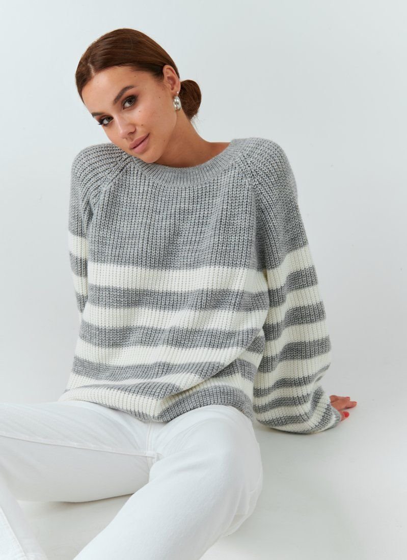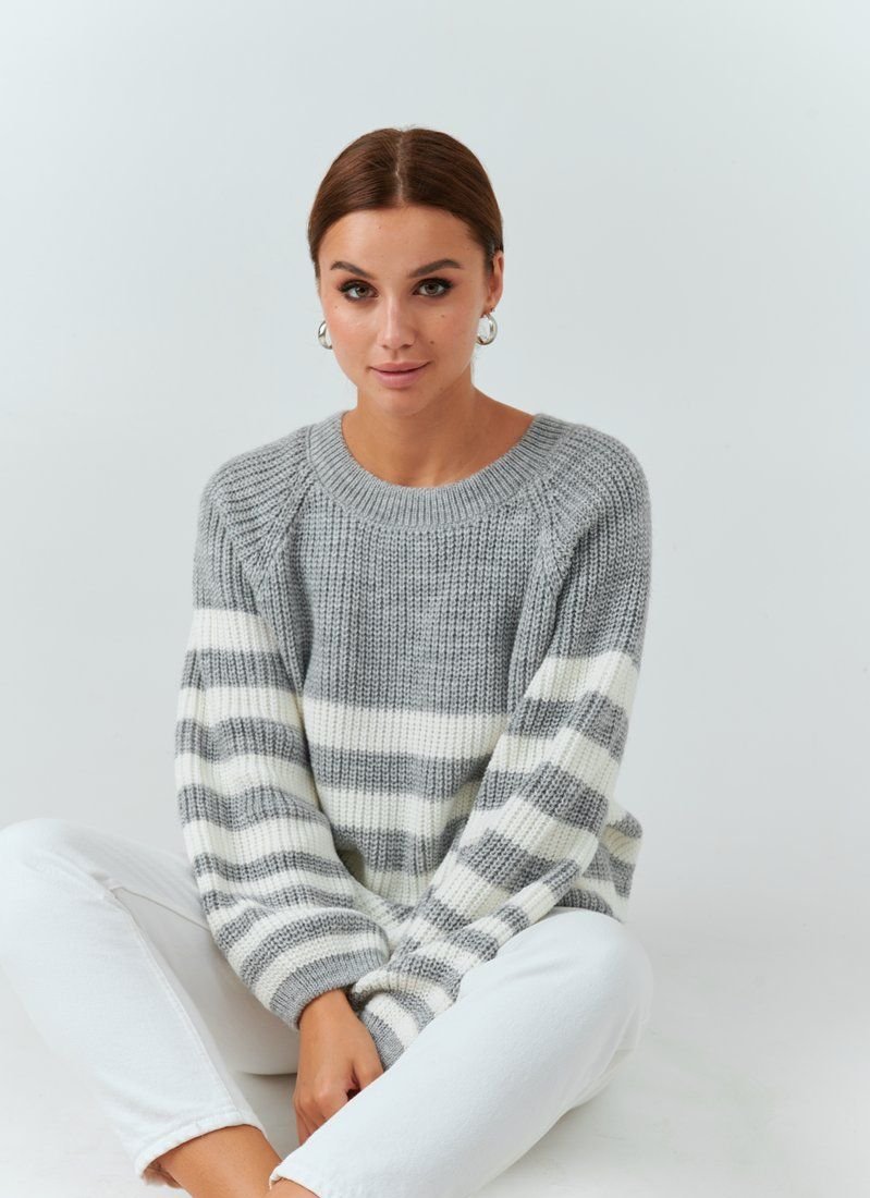 Oversize gray sweater with a wide stripe. The product is made of a pleasant knitted knit and will keep you warm in the cool autumn and winter.