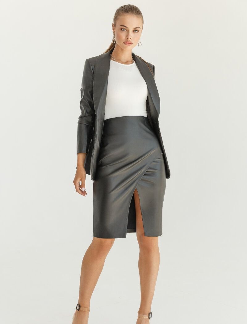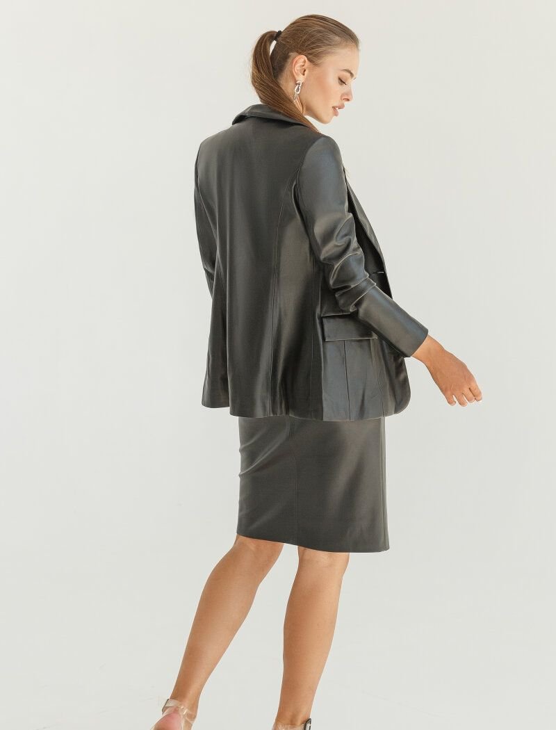 A fitted jacket on a classic black suede base is included in the new Gepur collection. The masters of the brand made a model made of dense eco-leather with a matte gloss. The jacket fits comfortably on the figure and does not restrict movement. The single-breasted model with a shawl collar is fastened with one button. The star collection was presented by travel blogger Dasha Kvitkova.