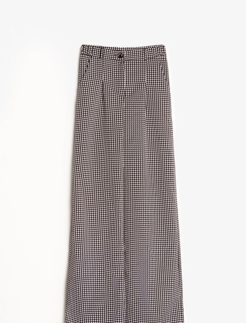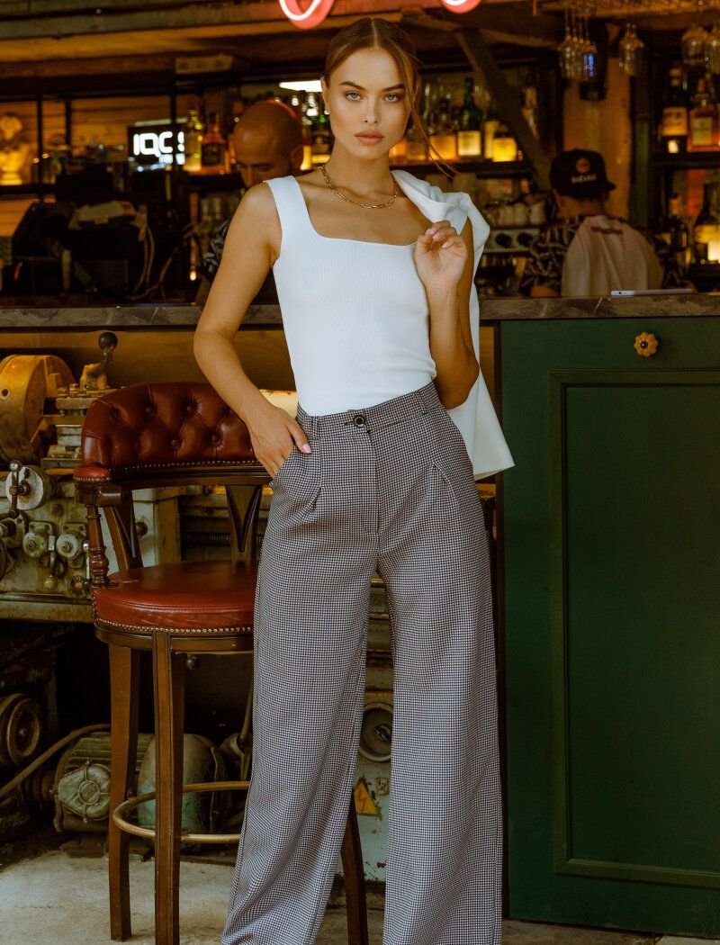 The high-rise trousers are complemented by side pockets and a black-and-white crow's feet" print an actual ornament of 2020. The model is suitable for relaxed casual bows, easily combined with clothes in different styles.