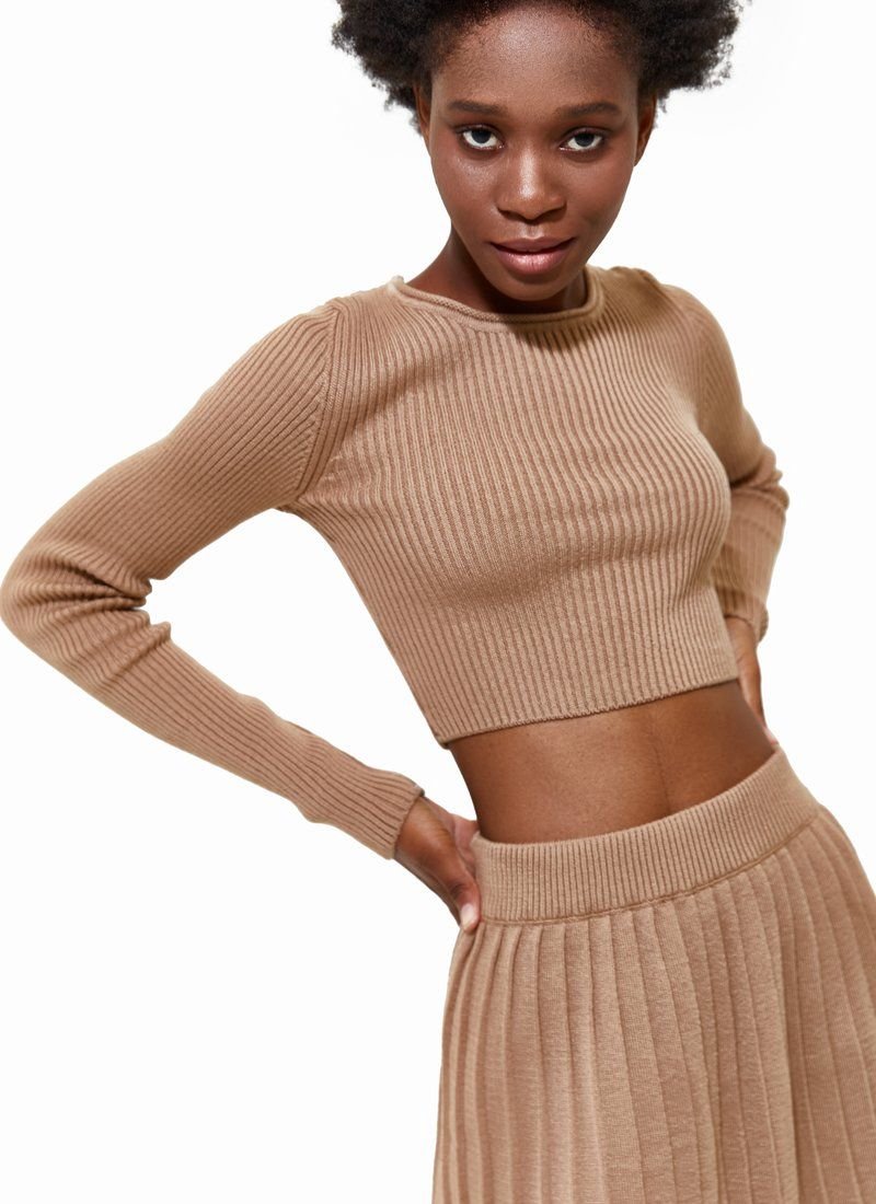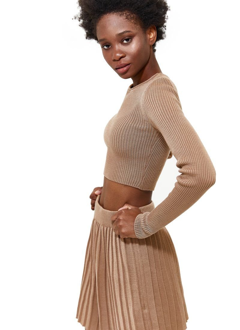 A beige knitted suit is presented with a pleated mini skirt and a shortened longsleeve. Such a set harmoniously fits into the image both as a basis and as separate elements.