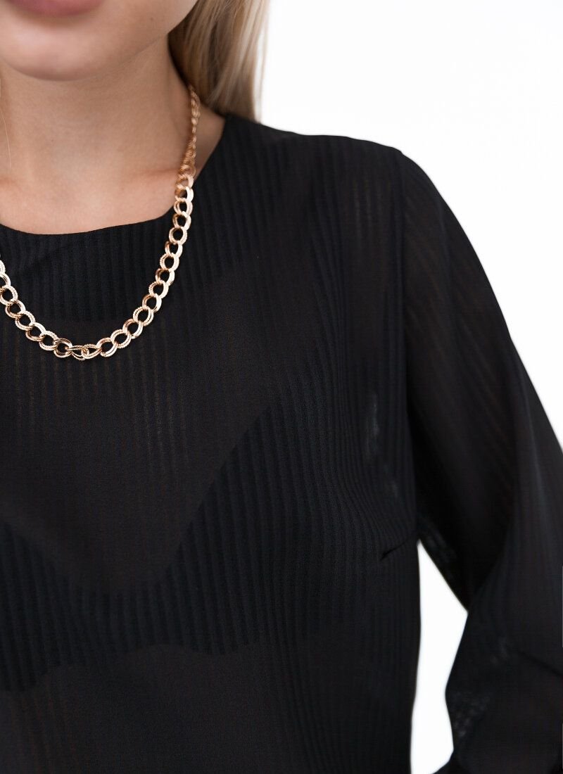 The black blouse is made of light textured chiffon. The wide sleeves of the model are decorated with ruffles along the u-shaped neckline. The blouse will boldly support the image in the style of total-black.