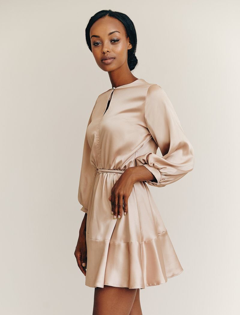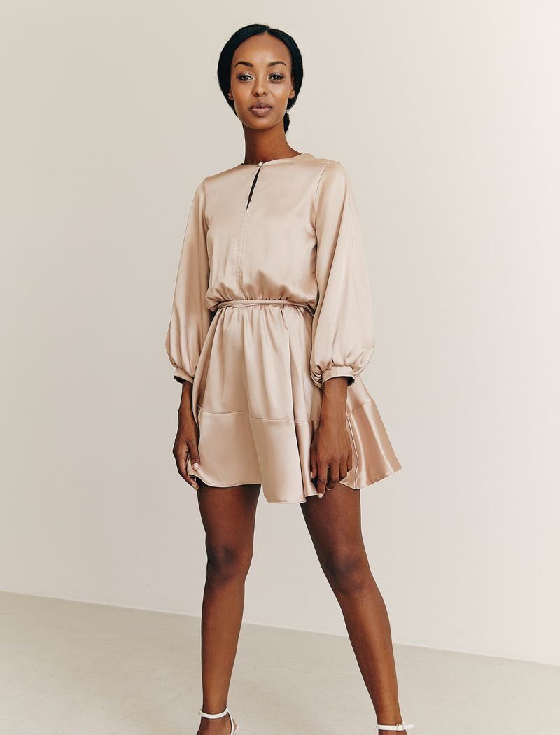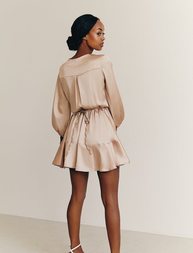A short beige satin dress with a round neck with a drop on the button. Long loose sleeve with thin cuffs. A dress with a belt in the form of a ribbon made of satin fabric, a skirt with a wide frill.